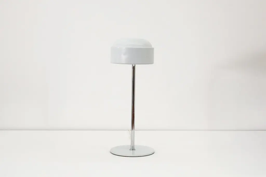 Swedish Mid-Century, Falkenbergs Belysning manufactured articulating table/task lamp with a pill box-shaped gray enameled shade and a gray enameled base mounted on a chrome stem. The light uses a (75W max) medium size bulbs. In total there are 4 lamps available that are in original condition with some varying degrees of wear including some enamel loss and scratches. This is all consistent with their age and regular use. Priced individually.