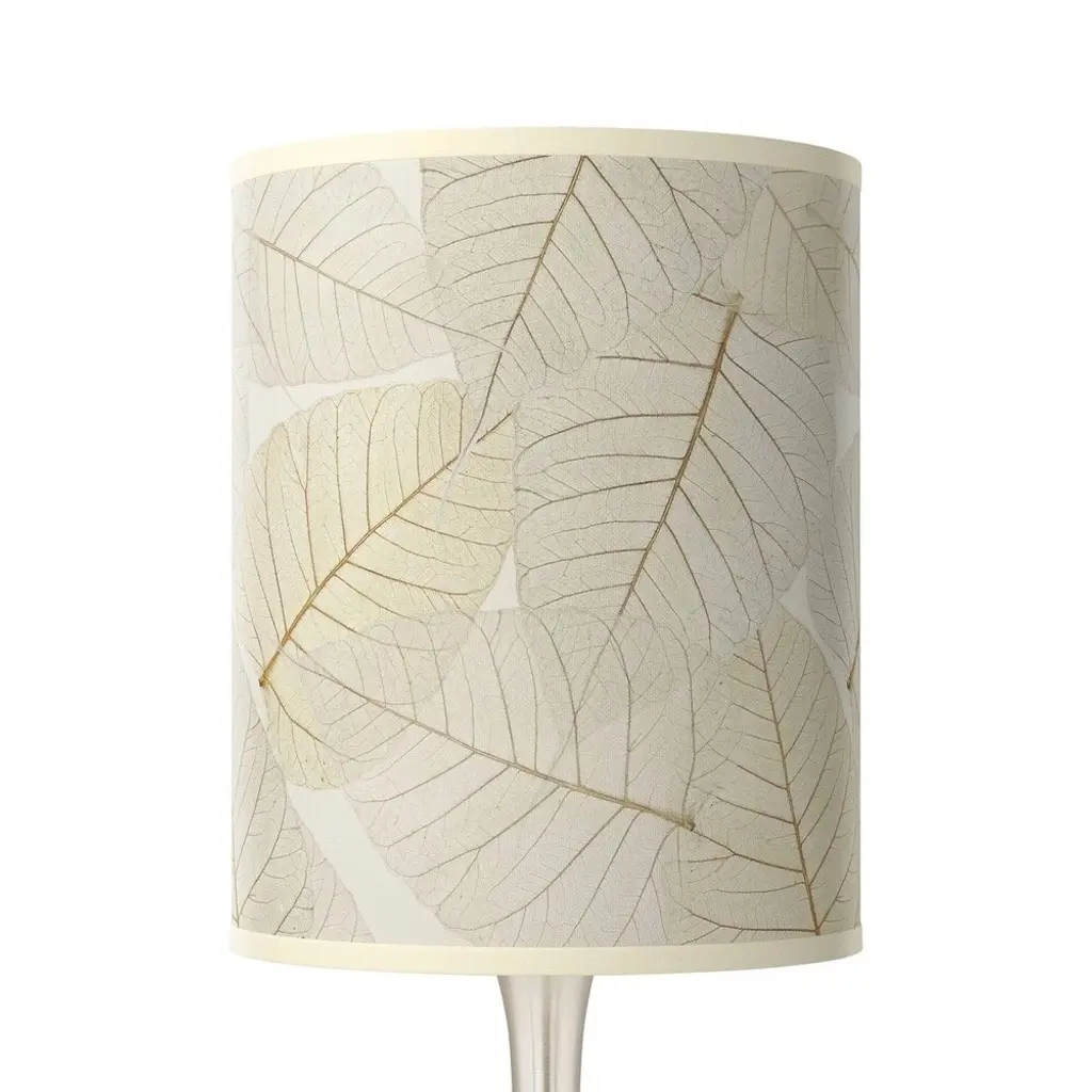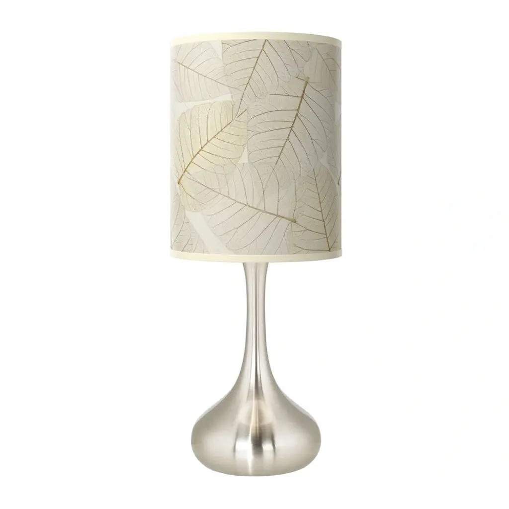 PRODUCT DETAILS: Overall: 23 1/2" high. Base is 7 1/2" wide. Shade is 9 1/2" wide x 11 3/4" high. Uses one maximum 100 watt standard base bulb (not included). In-line on-off switch. Droplet table lamp. Custom-printed Fall Leaves giclee pattern shade. Brushed nickel finish.