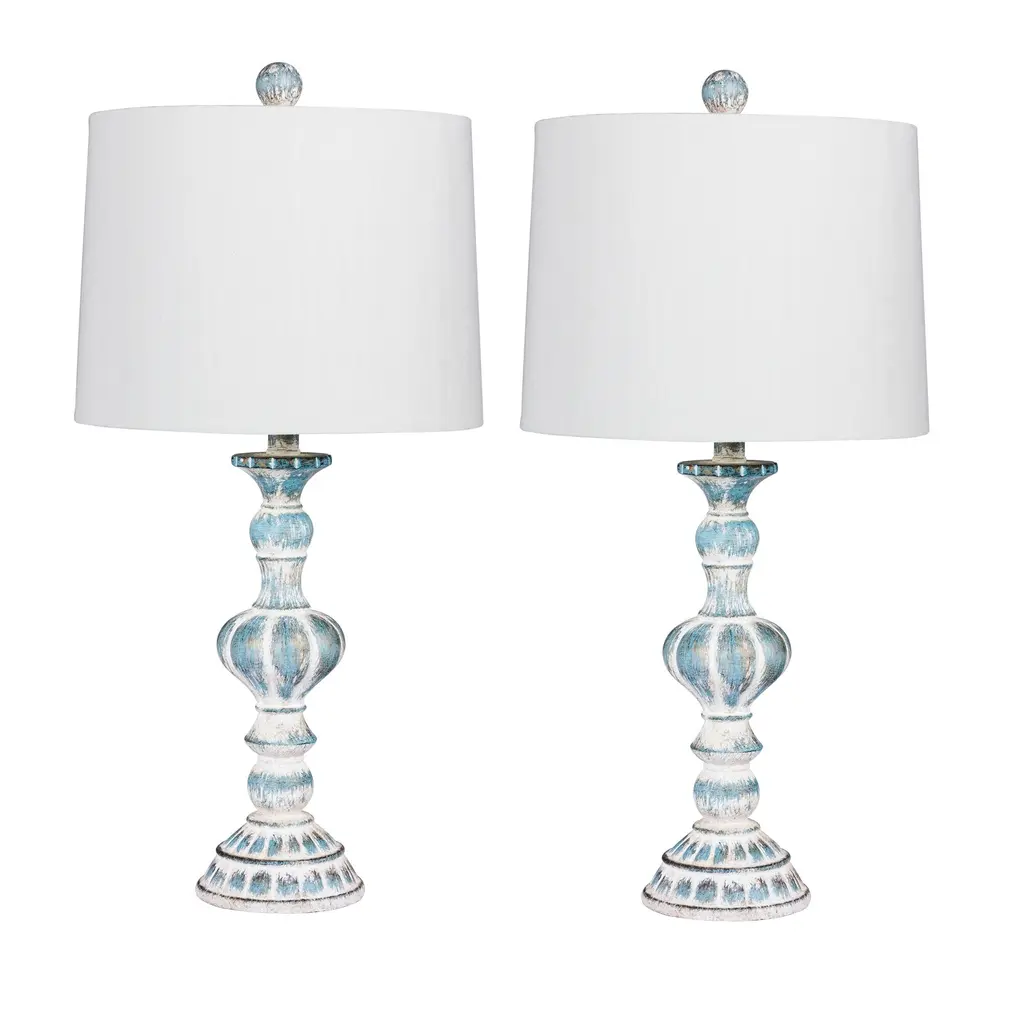 Bring a touch of countryside charm to your living space with this set of Blue Sculpted Candlestick Table Lamps from Fangio Lighting. Made of resilient resin material, the lamps feature an antique blue finish that adds a touch of rustic elegance. Each lamp comes with a white drum shade that provides a soft and warm glow, and an on/off switch for easy control. UL and CSA listed for safety, these lamps require one bulb with a maximum wattage of 100 (not included). Standing at 26.5 inches tall, these lamps are perfect as bedside table lighting or to add a cozy ambiance to any room.Features: