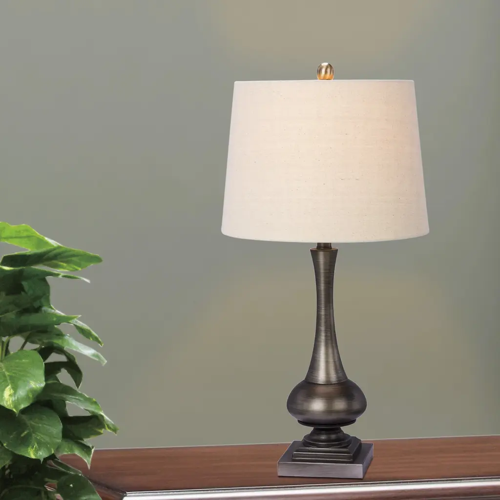#1553 28 in. Metal Table Lamp in a Dark Silver Finish is sure to instantly charm. Attention to detail can be found in the striking look and stunning design that will add a subtle Transitional flare to your favorite space. The Dark Silver finish is among the most desired in homes today! Lamp includes a designer shade made in a decor friendly hue of Oatmeal. Light. This item takes 1 bulb with a maximum wattage of 150 (Not Included. (Lamp is UL and CSA Listed. Showcase your discerning tastes brilliantly with this item. The stylized, Genie Bottle look possesses its own presence while illuminating your exquisite decorating tastes. If you enjoy the graceful lines of Transitional designs, this is the lamp for you! Bring this item home! You will be glad you did!The Dark Silver finish is among the most desired in homes today!Designer Shade Size (Top x Bottom x Height): 12X14X10 Lamp includes a designer shade made in a decor friendly hue of Oatmeal Designer Shade Material: LinenLight comes complete with an easy to use 3-Way switch This item takes 1 bulb with a maximum wattage of 150 (Not Included.)Lamp Style Is Perfect For Transitional Decorating TastesItem Comes With A 1 Year WarrantySetting: IndoorFixture finish: SilverShades: One (1) LinenNumber of lights: One (1)Requires Requires one (1) 150-watt medium base 3-Way bulb (Not Included)Socket switchDimensions: 14 in L x 14 in W x 28 in HAssembly required.