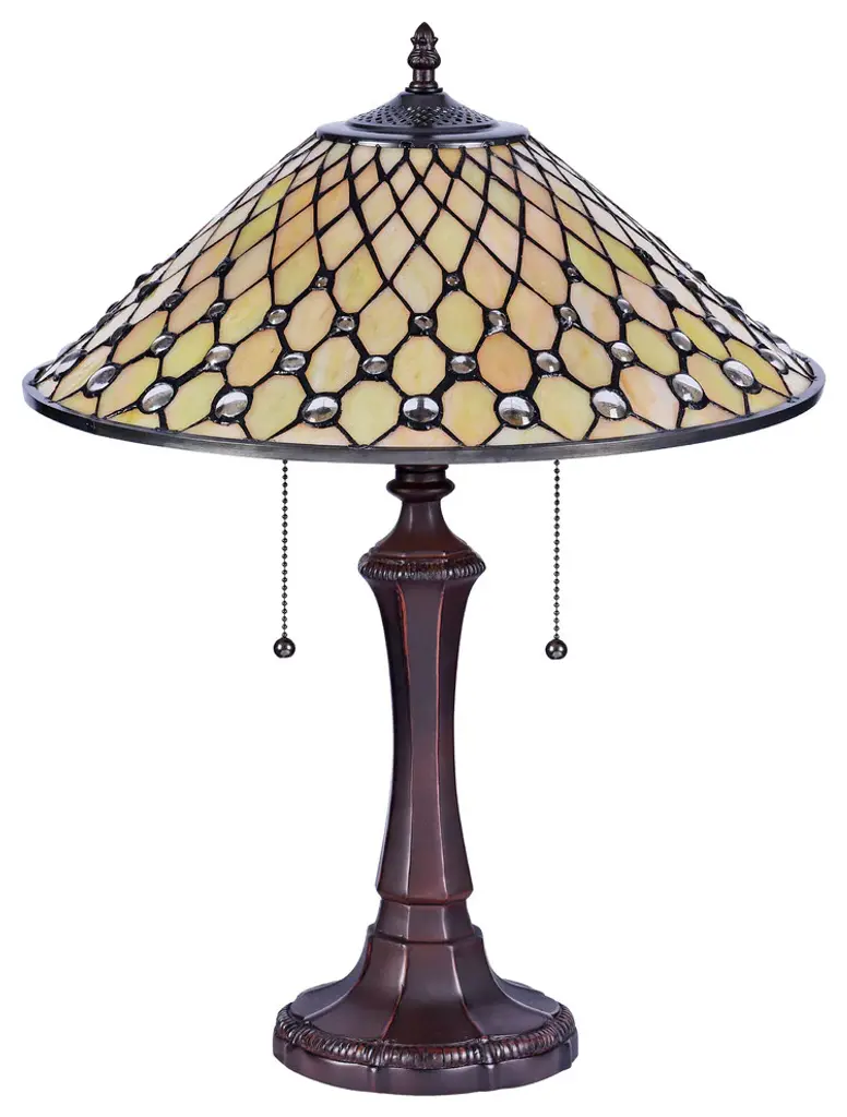 FANNY, a graceful Tiffany-style table lamp. The minimal design of this table lamp brings timeless beauty to any space. Perfect by your bed, for you study room, and the living room. Handcrafted using the same techniques that were developed by Louis Comfort Tiffany in the early 1900s, this beautiful Tiffany-style piece contains hand-cut pieces of stained glass, each wrapped in fine copper foil.Bulb Type: Incandescent; LED; Compact Fluorescent (CFL)Number of Bulbs: 2Bulbs Included: NoUL Listed: YesBulb Wattage: 100Hardwire or Plug: Plug