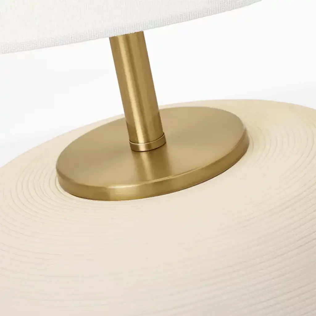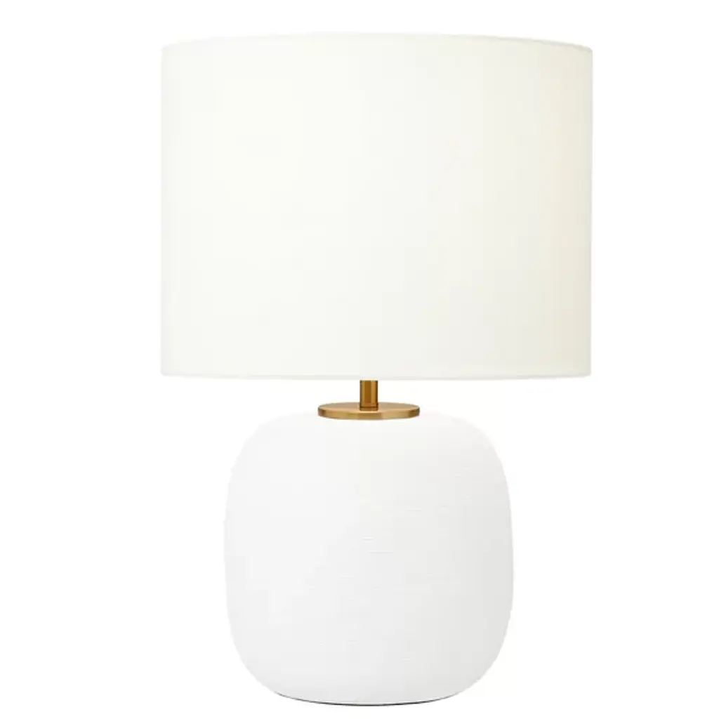 Timeless design with an elegant air. The Fanny Wide Table Lamp from Visual Comfort Studio, formerly known as HABLE, adds a vibrant, stylish presence to nightstands or side tables; its rounded ceramic body with subtle, horizontal ring accents sweeps upward to a sleek metal disc and central stem holding the fixture’s lamping. A cylindrical shade fashioned from translucent fabric extends down over the lamping, casting direct light across the matte-textured, grooved body to reveal a vibrant assembly of light and shadow.