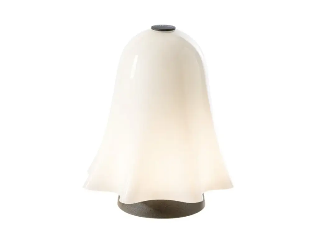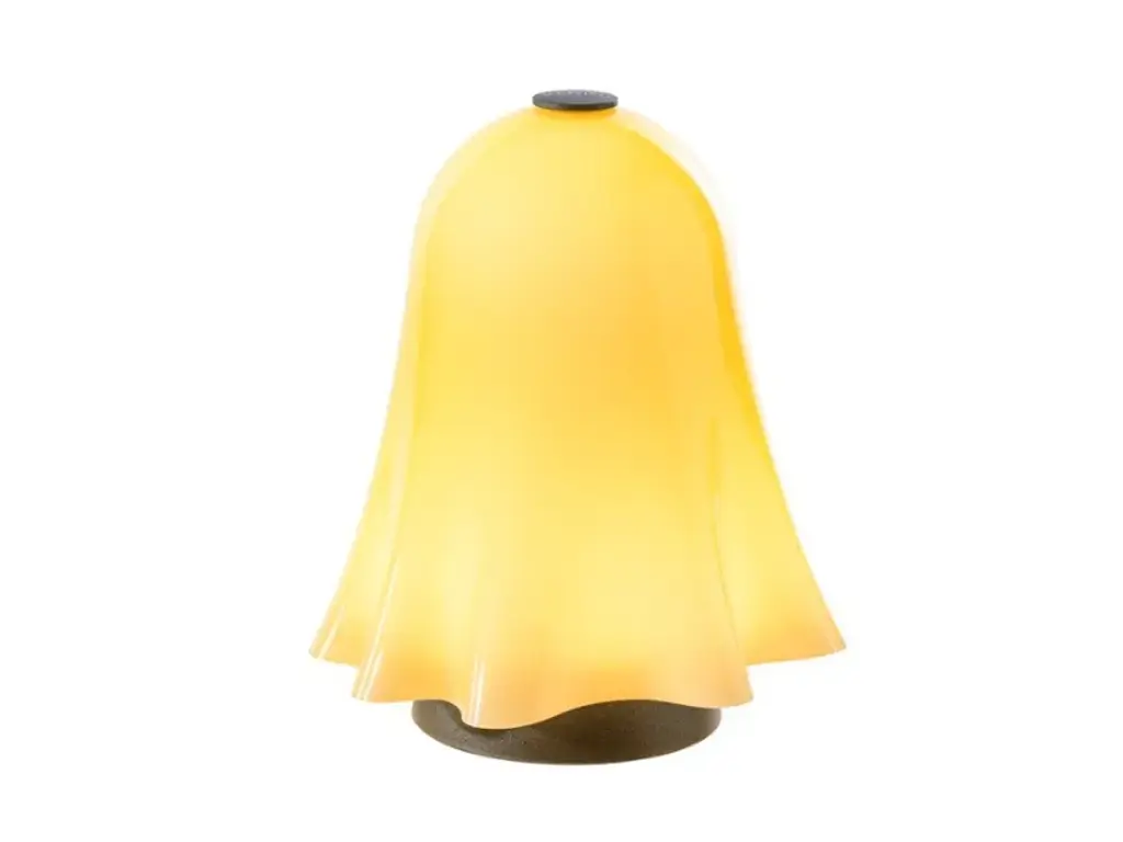 Fantasmino is a table lamp made of opal blown glass obtained by overlapping the milky glass with other glass, the opal glass is blown and handmade. The structure is made of burnished metal.Light source:1 x max 1,5W LED 5V - DimmerColors:Orange, Lattimo, Red, Aquamarine, Amber