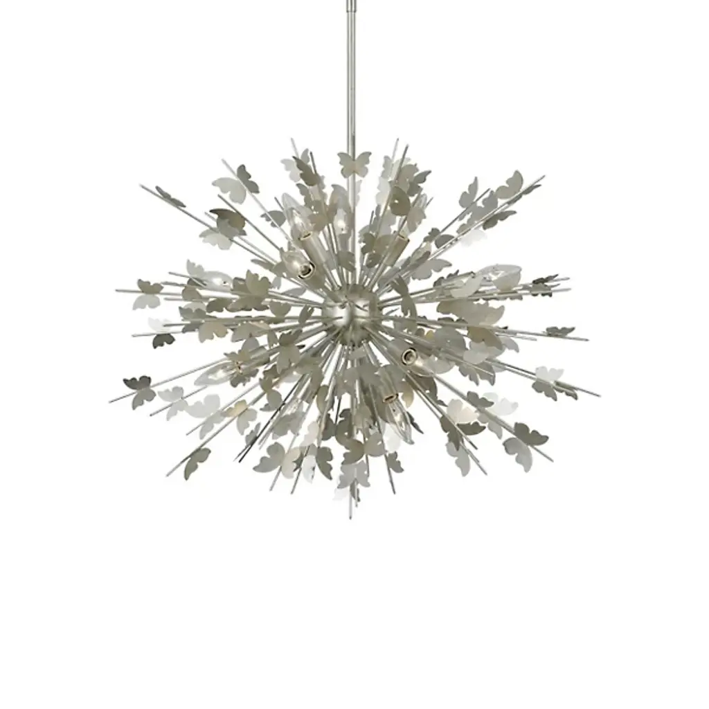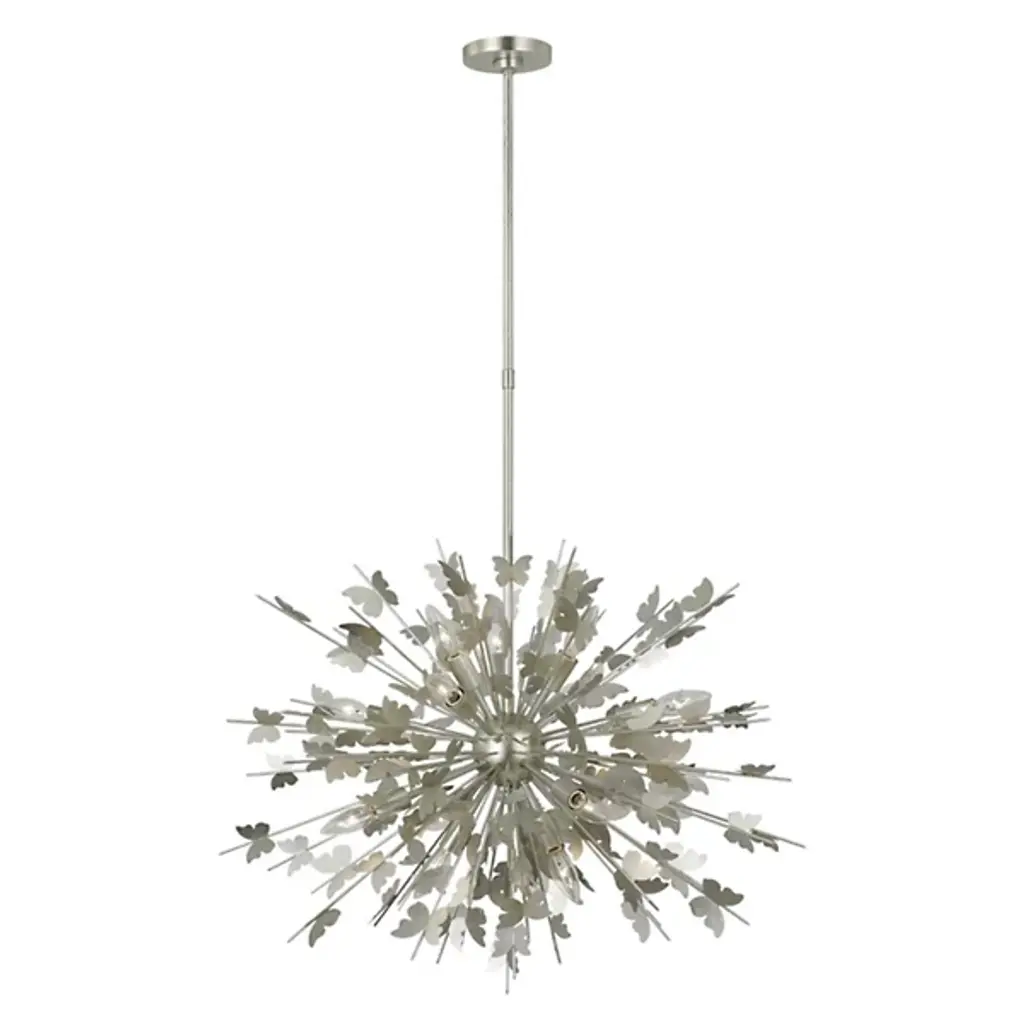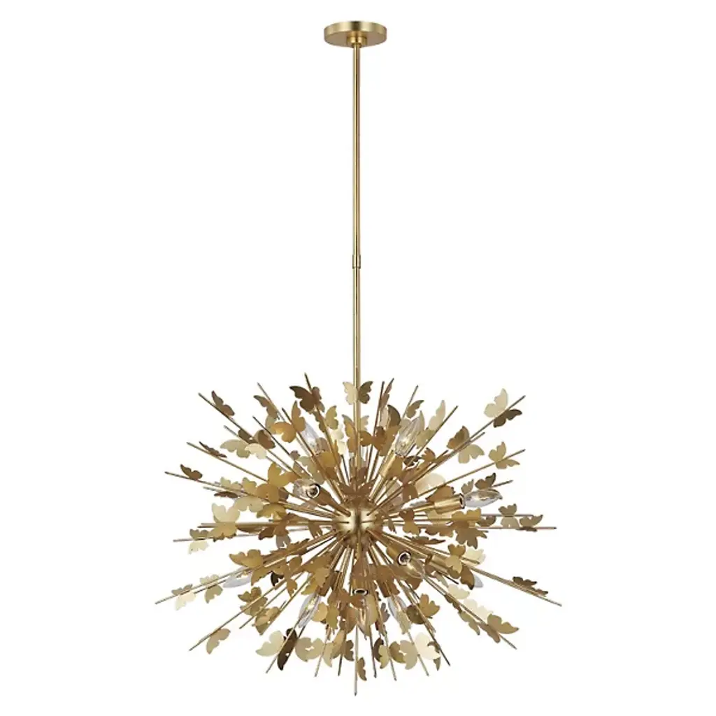 The Farfalle Medium Chandelier from Visual Comfort Signature, formerly known as Visual Comfort, offers an impactful appeal to interiors using a simple form accentuated with small, rich details. Simply secured via a circular canopy, it uses a long metal downrod to secure an orb-shaped accent below, replete with evenly-spaced candelabra lamps that extend in all directions. A series of slim metal rods extend out around the lamping, each one accentuated by a small butterfly-silhouette accent that adds a playful natural accent to the proceedings