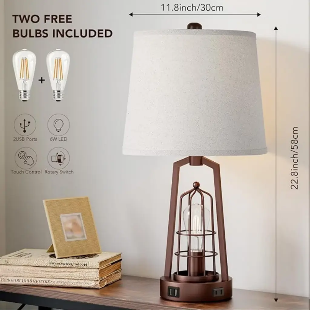 Bring warmth, charm, and functionality to your home with the Cuddlewood Farmhouse Table Lamps Set of 2, a unique blend of rustic design and modern convenience. Featuring a sturdy oil-rubbed bronze body, artistic birdcage-style base, and classic linen shade, these lamps exude a vintage farmhouse appeal while offering innovative lighting control. With both top and bottom lights, this dual-illumination design allows for broader lighting coverage, creating a cozy, ambient glow that’s perfect for bedrooms, living rooms, or home offices. Thoughtfully engineered with two independent controls, the top light is operated by a rotary switch, while the base light features 3-way dimmable touch control—making it easy for users of all ages to adjust brightness levels with just a tap. Choose from three lighting modes: upper light only, lower light only, or both lights on simultaneously to suit your mood or activity. Whether you’re reading, relaxing, or using it as a nightlight, the adjustable lighting gives you full control. Beyond lighting, this lamp serves as a convenient charging station for all your devices. Equipped with 2 USB ports and 1 AC outlet, you can power up your phone, tablet, or laptop simultaneously—even when the lights are off. This makes it an ideal solution for bedside tables or workspaces where functionality and style meet. The set includes four ST58 dimmable LED bulbs (2700K, 800 lumens), offering the warm glow of a 60W incandescent bulb while using only 6W of energy. These eye-friendly bulbs are flicker-free and glare-free, helping reduce eye strain while saving on energy costs. Designed to blend beautifully into any rustic, vintage, or industrial décor, these lamps also make a thoughtful gift for holidays, housewarmings, or special occasions. Each lamp measures 22.8" H x 11.8" W x 11.8" D, providing a well-balanced profile for nightstands, end tables, or desks without overwhelming your space.