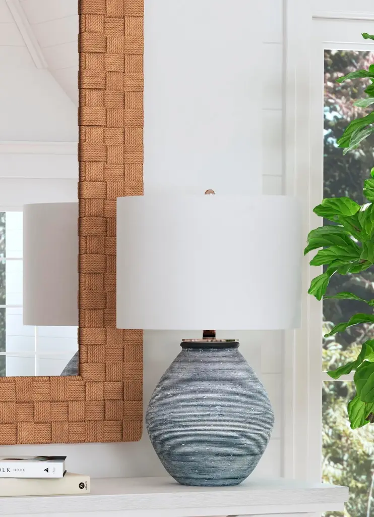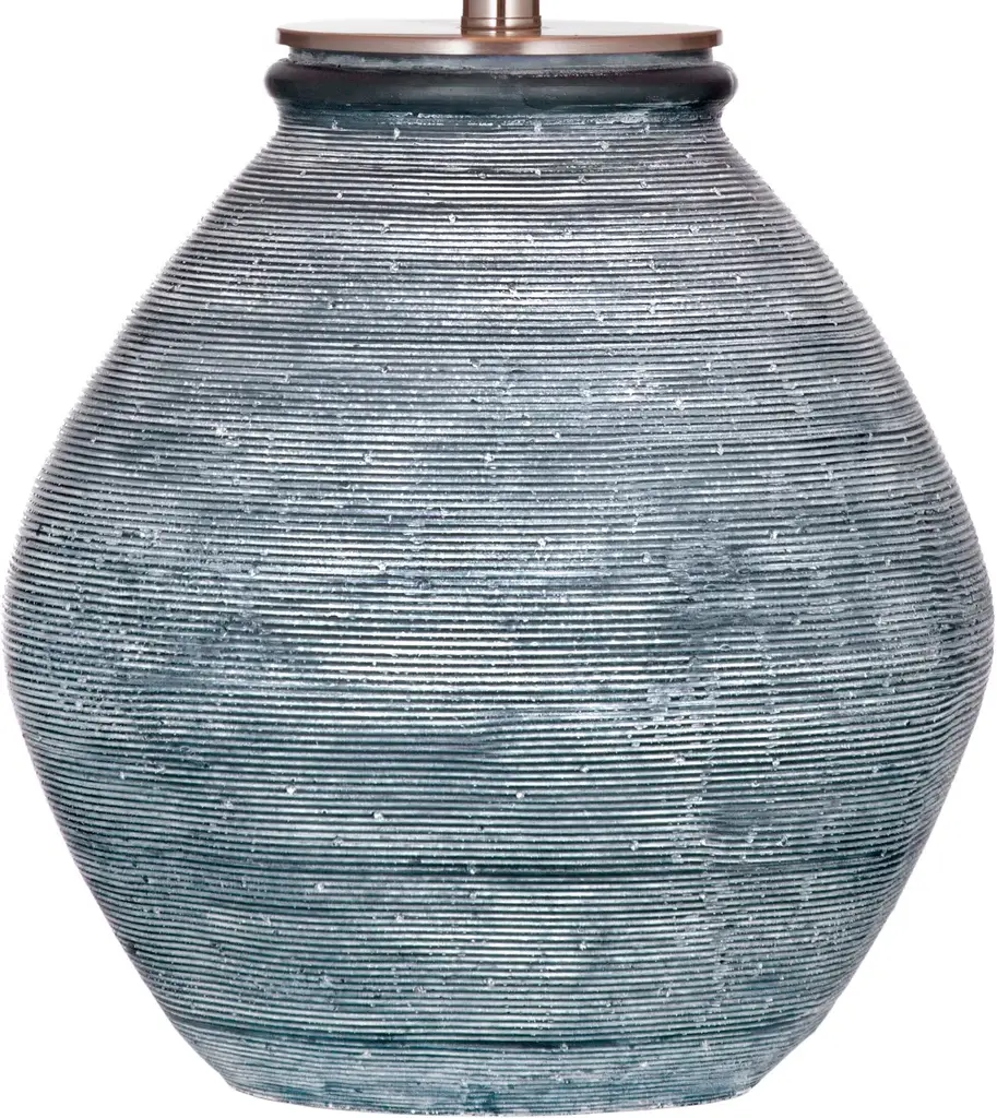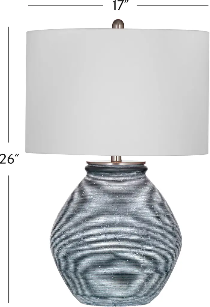 The Faro Table Lamp has an industrial look with a refined touch. Featuring a matte blue finish with white drum shade that both highlights the design and adds a contemporary edge.