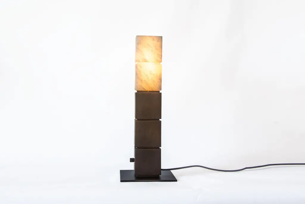 A totem of carved natural alabaster atop solid cast oil rubbed bronze torchiere.Models in the collection are individually hand-crafted by the skilled artisans in our studio. Custom versions tailored to a specific setting are available by commission. The Thomas Cooper Studio collection represents a multilayered, multifaceted collaboration, where Materials and techniques join forces in a search for the inner poetry of each piece: heat-formed, mouth-blown, flash-cracked glass; carved marble, alabaster, and natural stone; cast and hand-patinaed bronze; hand-polished, leaded crystal. At the same time, a study of sculptural expression creates a balance between shine and shade, density and delicacy, form and function.