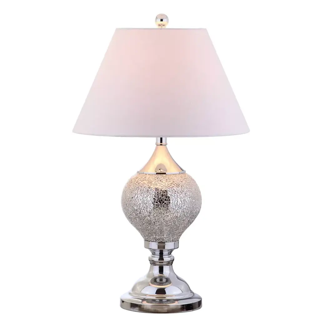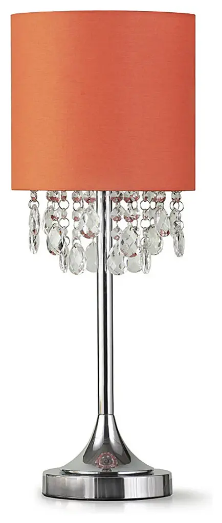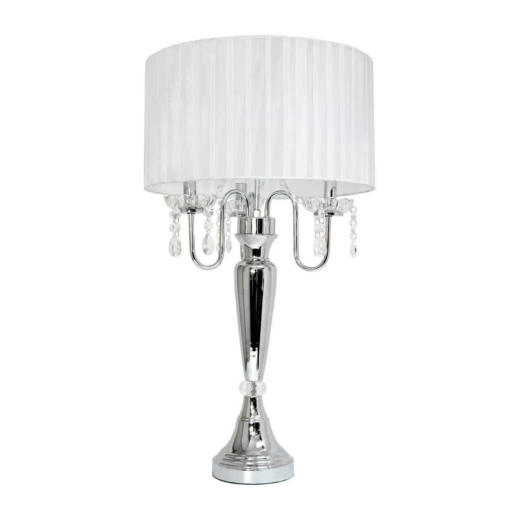 Description:Delicate crystal beading cascades from the bottom of the drum lamp shade of this formal chrome finish table lamp style with a clean and sleek touch. Topped with a white/black drum shade to complete the look.Features:Dimensions: