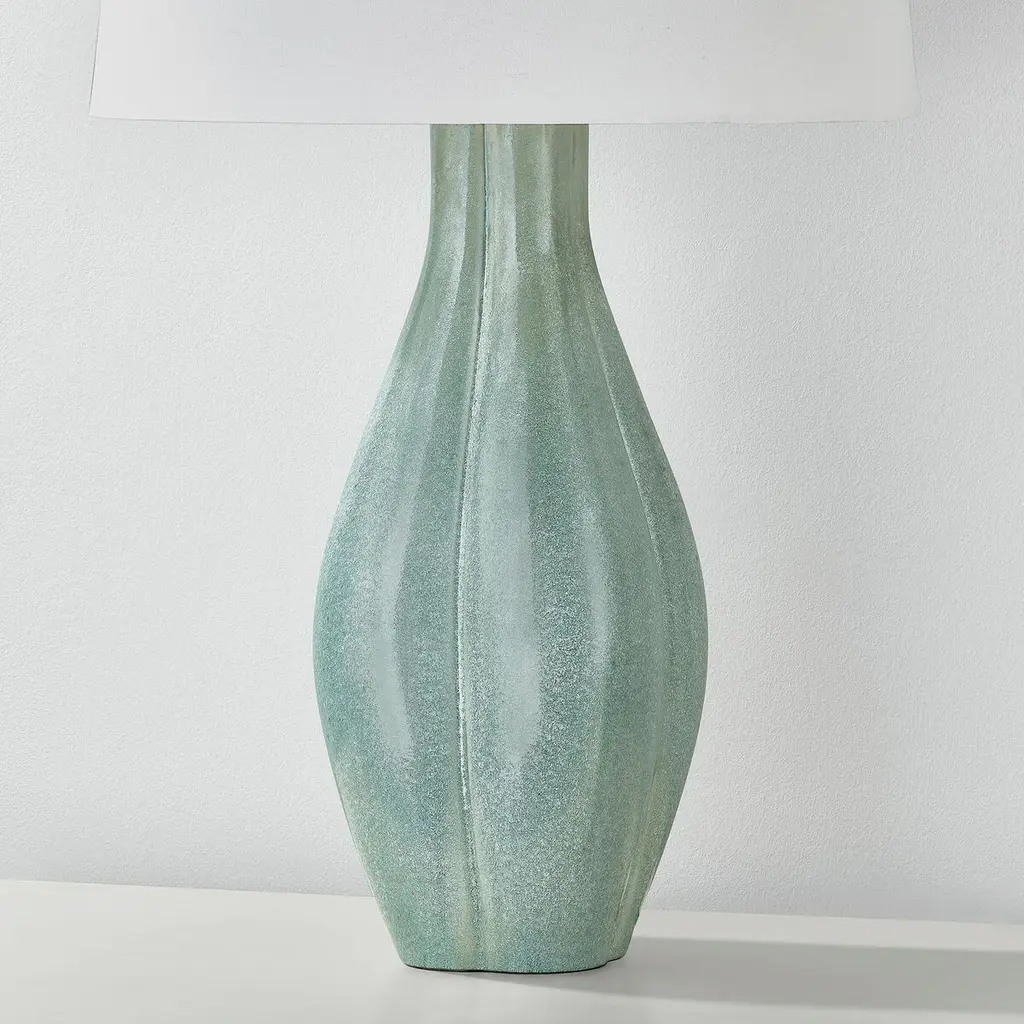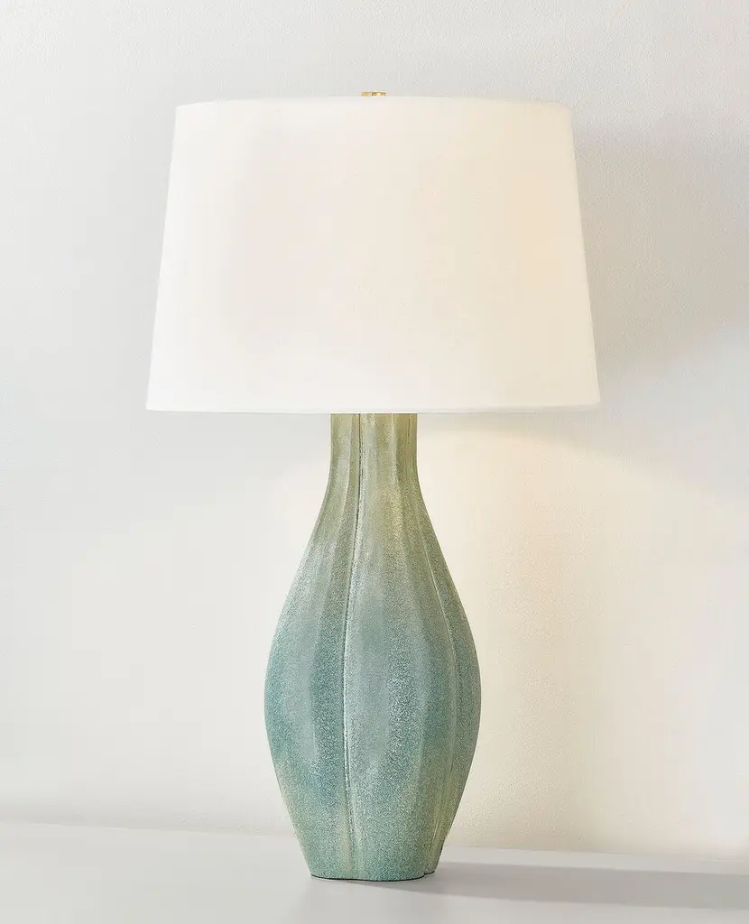 Reminiscent of clouds, three abstract shapes converge to elegantly form the base of this sculptural table lamp. The smooth finish gives this voluminous lamp a comforting feel that results in a sense of serenity wherever it is placed. A large linen drum shade balances the perfect proportions.