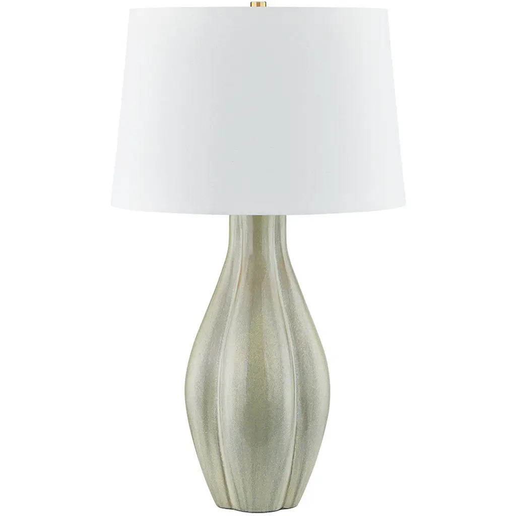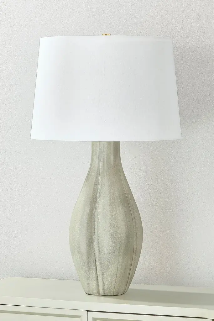 Reminiscent of clouds, three abstract shapes converge to elegantly form the base of this sculptural table lamp. The smooth finish gives this voluminous lamp a comforting feel that results in a sense of serenity wherever it is placed. A large linen drum shade balances the perfect proportions.