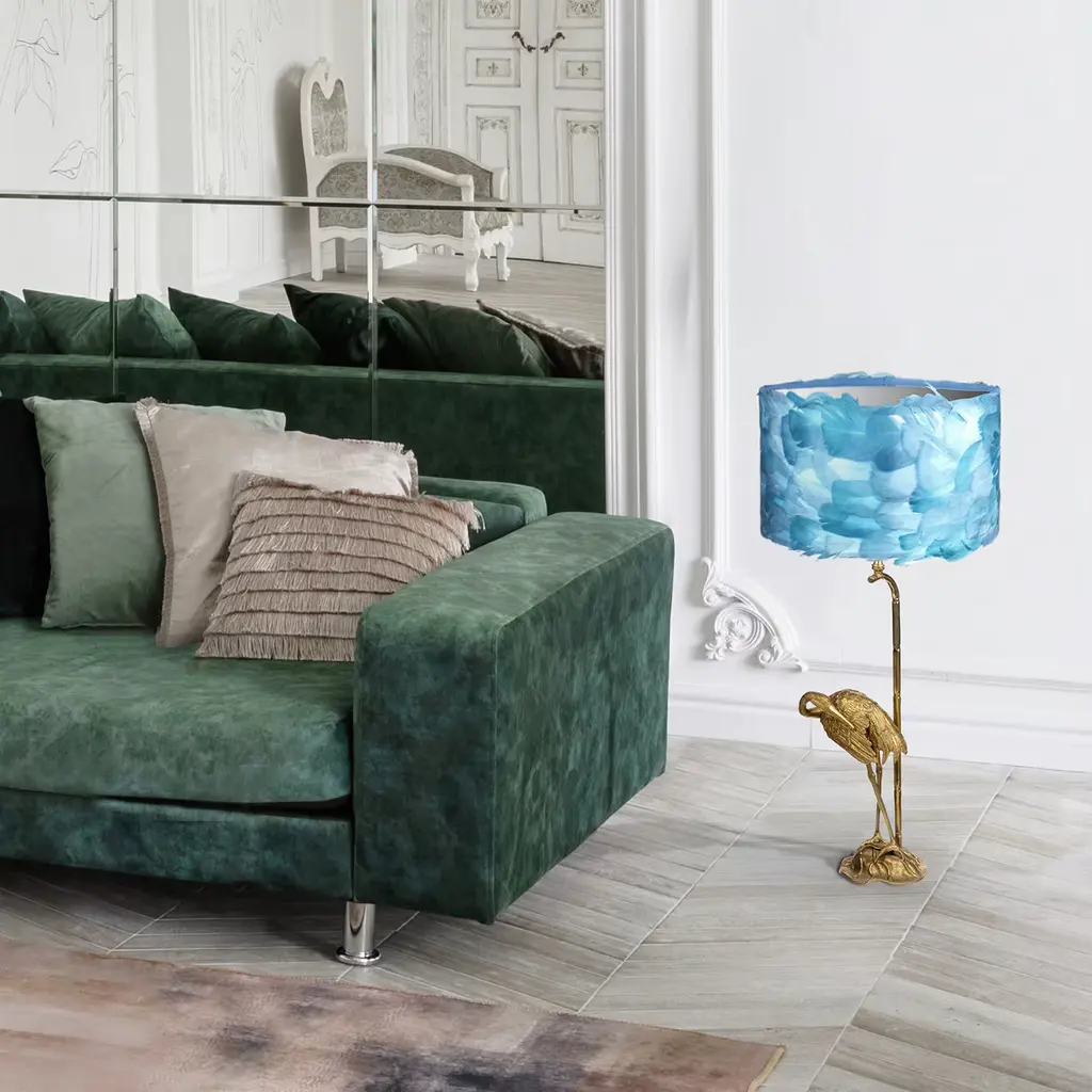 The Fauna Ornamental Table Lamp with classic style brass heron and bamboo stem is embellished by the lampshade featuring the application of real light blue feathers. Part of the Eclectic Line by Brass Brothers & Co, the lamp will display small variations and imperfections due to the craftsmanship, making each piece unique.