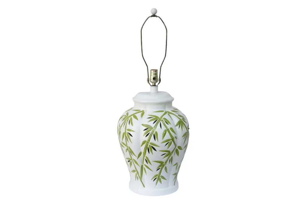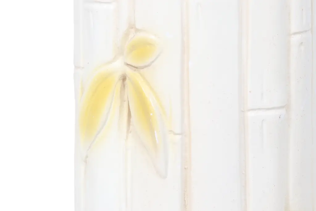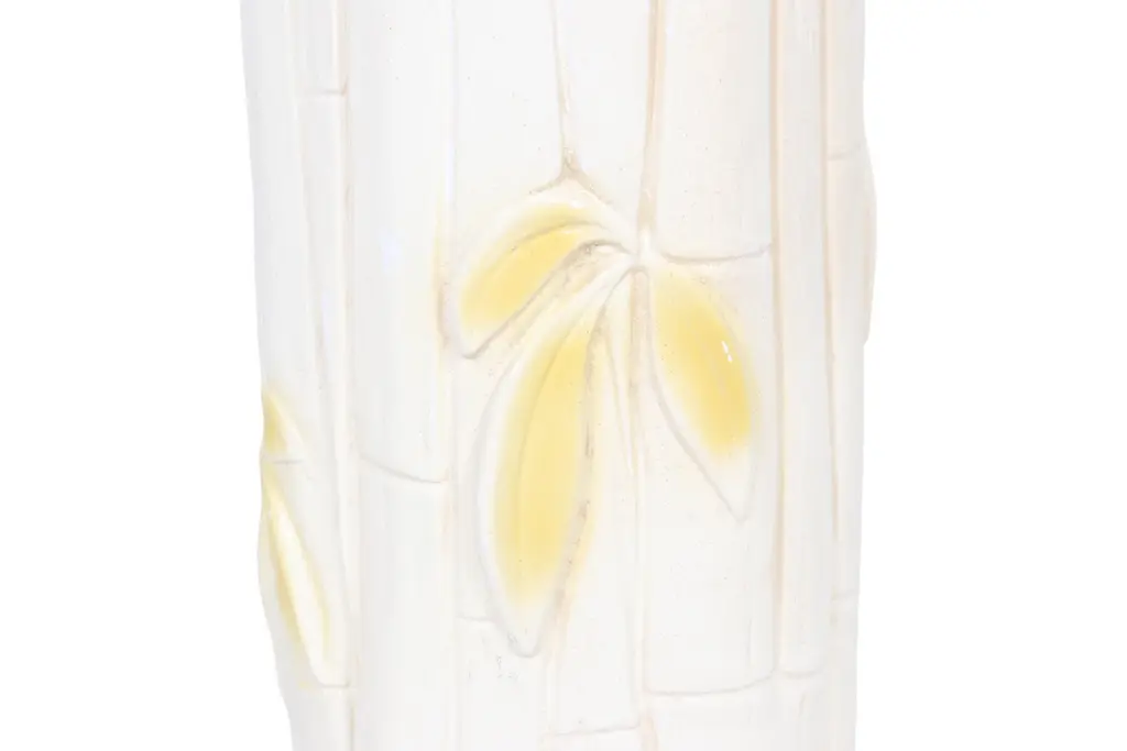 A coastal style ceramic table lamp pressed to give the look of bamboo. Detailed with yellow leaves around the body and circles on top to indicate multiple canes.
