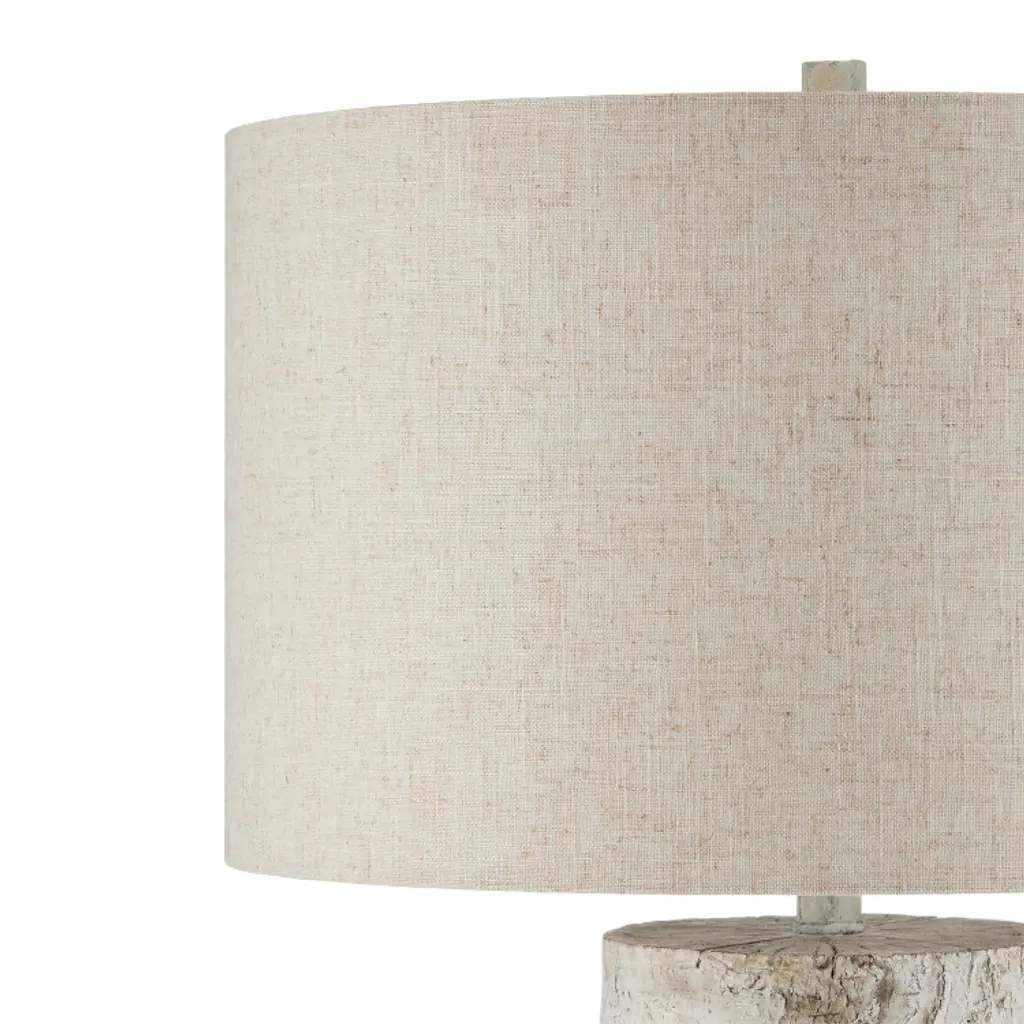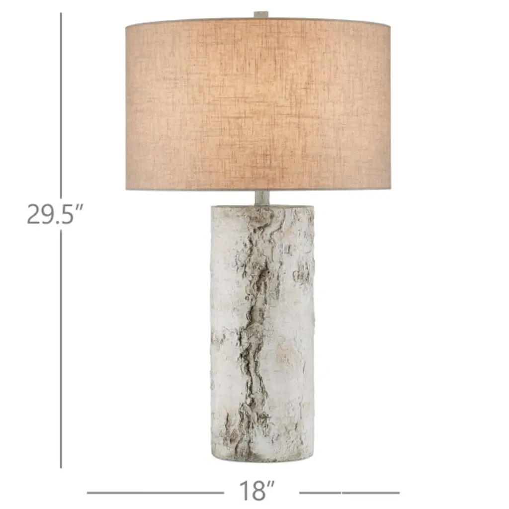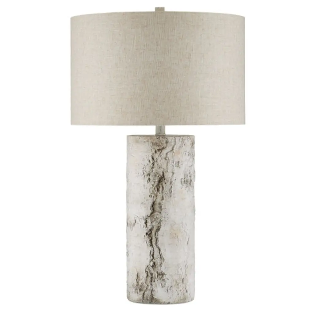 The Faux Birch Table Lamp presents a profile that mimics a tree trunk, yet it is an artisanal creation crafted from concrete. The illusion of wood is achieved through a hand-painted finish in birch white and gray hues, with dark patterning that appears as it would on a real tree.