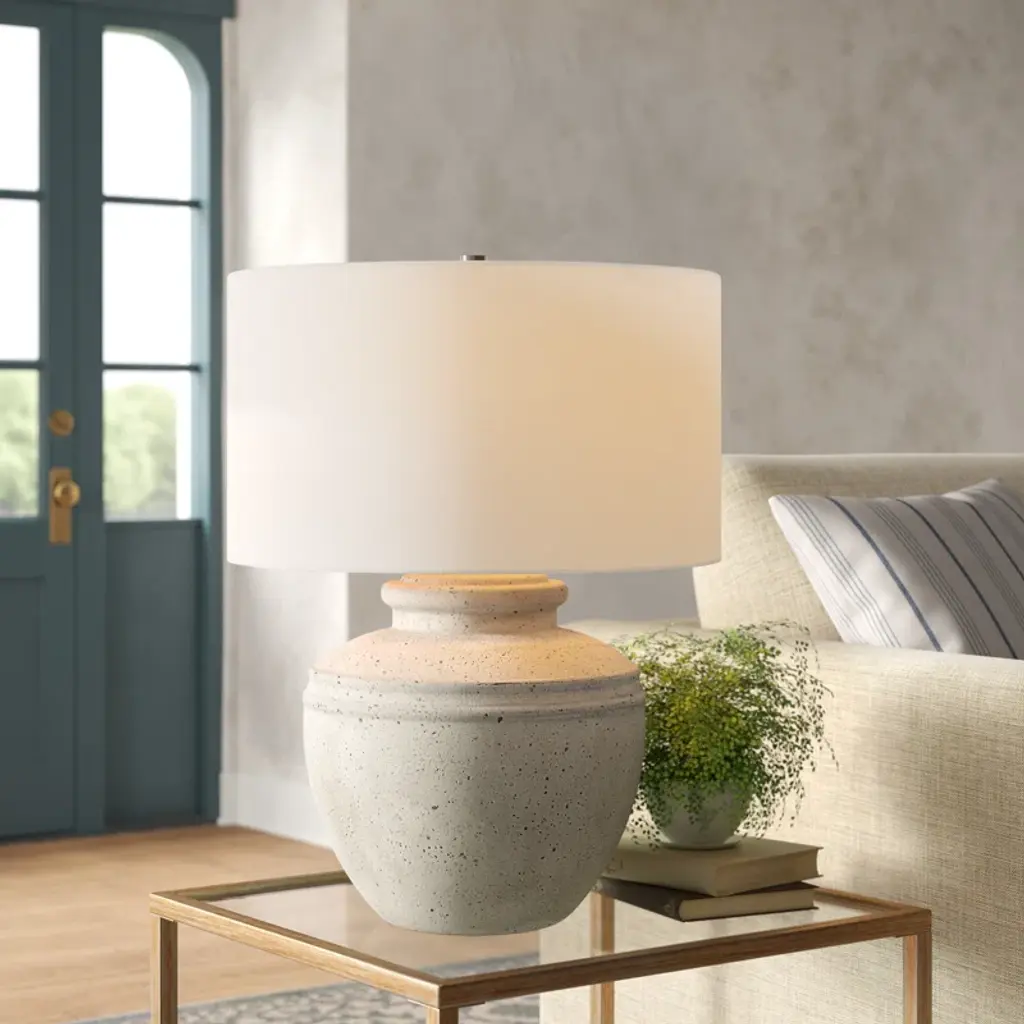 Inspired by antique pottery, this ceramic table lamp features an aged stone finish with character distressing and dark undertones, accented with plated brushed nickel details. The drum shade is covered in a light gray linen fabric.