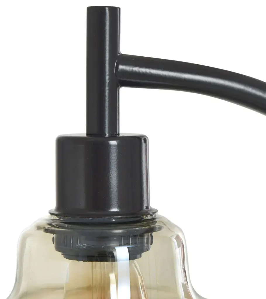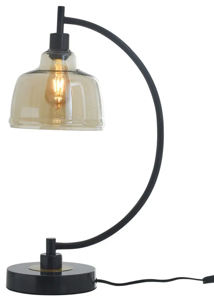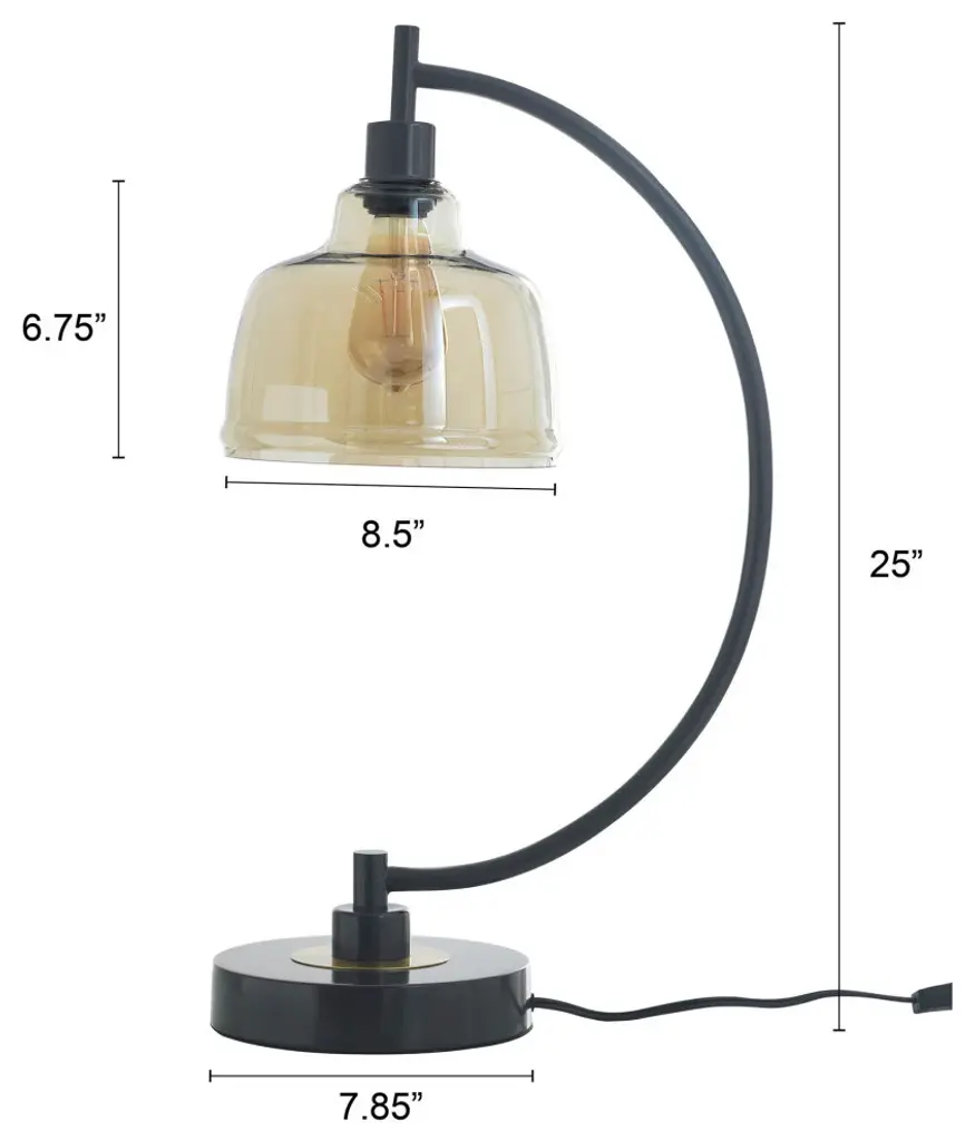 The Black Water table lamp incorporates a sleep, vintage-inspired look into the modern home with ease. Crafted around a simple arched metal frame with a glass pendant shade, this light introduces a sleek kind of industrial touch. This lamp is the perfect accent for bedsides and classic chair-side tables.Features: May be paired with coordinating floor lamp L717984DS to complete the collection (sold separately)Style: Art DecoFinish: Black, GoldShade Finish: AmberMaterial: Metal, GlassShade Material: GlassLength: 8.5 inchesWidth: 8.5 inchesHeight: 26 inchesVoltage: 110VWattage: 40Safety Rating: Dry Location - This item is rated for dry locations, meaning it can be used in an indoor area that is not normally subject to dampness. May include a location subject to temporary dampness provided ventilation is adequate to prevent any accumulation of moisture such as the bathroomBulb(s) Included: NoBulb Type: Incandescent Number of Bulbs: 1Due to lighting and monitor differences, actual colors and finishes may vary slightly from what appears online.