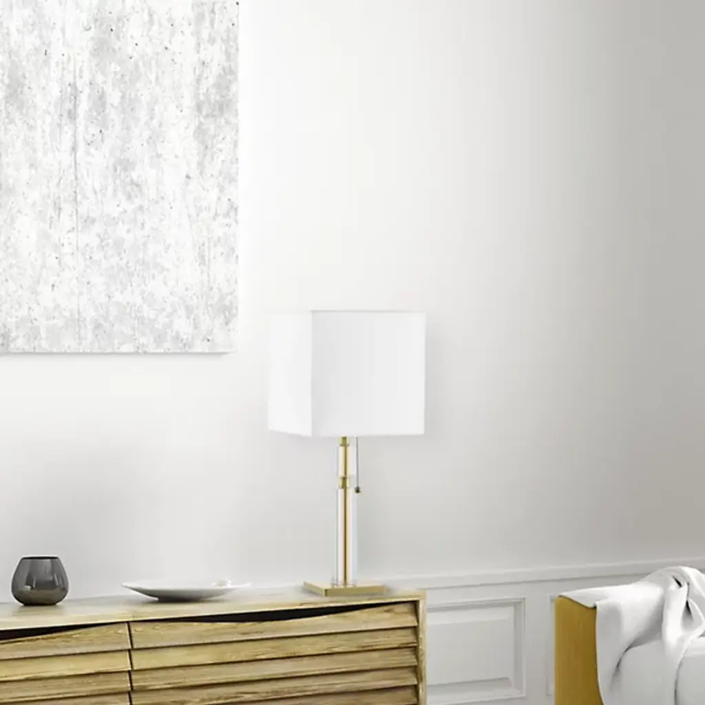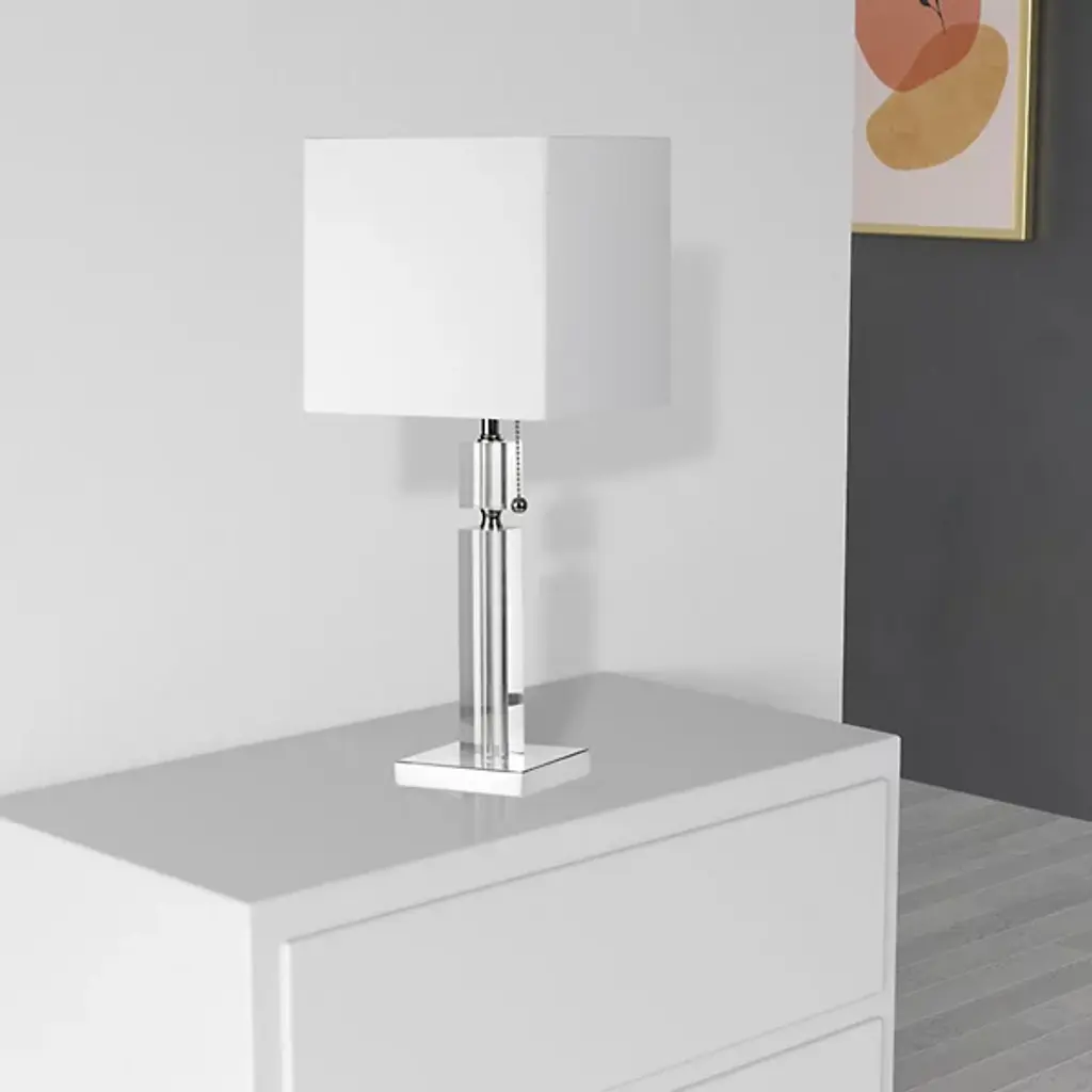 Modern sophistication with snazzy geometry. The Fernanda Crystal Square Table Lamp from Dainolite amps up the visual interest in a room with its illumination and reflected surfaces. From the square base, up to its column and stylish pull, sleek metal guides the eye as brief yet impactful accents. Clear crystal blocks lined up over the column stun in their complex reflections. A cubed linen shade reiterates the cool geometry of the piece with an elegant milky hue. The soft surfaces of the shade filter out an ambient glow that’s pleasant to be seated next to.