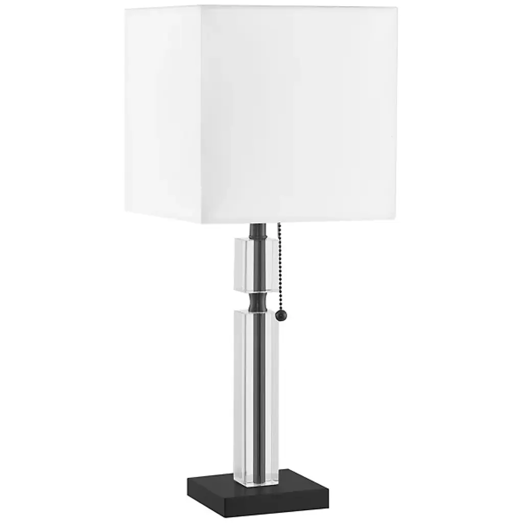 Modern sophistication with snazzy geometry. The Fernanda Crystal Square Table Lamp from Dainolite amps up the visual interest in a room with its illumination and reflected surfaces. From the square base, up to its column and stylish pull, sleek metal guides the eye as brief yet impactful accents. Clear crystal blocks lined up over the column stun in their complex reflections. A cubed linen shade reiterates the cool geometry of the piece with an elegant milky hue. The soft surfaces of the shade filter out an ambient glow that’s pleasant to be seated next to.