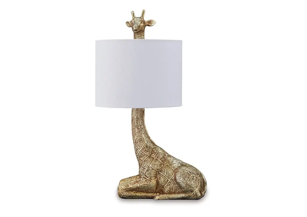 This giraffe lamp combines contemporary style with eclectic charm. The curious animal peeks out over the top of the shade, adding a playful touch to the safari-inspired vibe. For glam appeal, a goldtone finish completes the look. - Product Details provided by Manufacturer, Slumberland not responsible for errors in information.