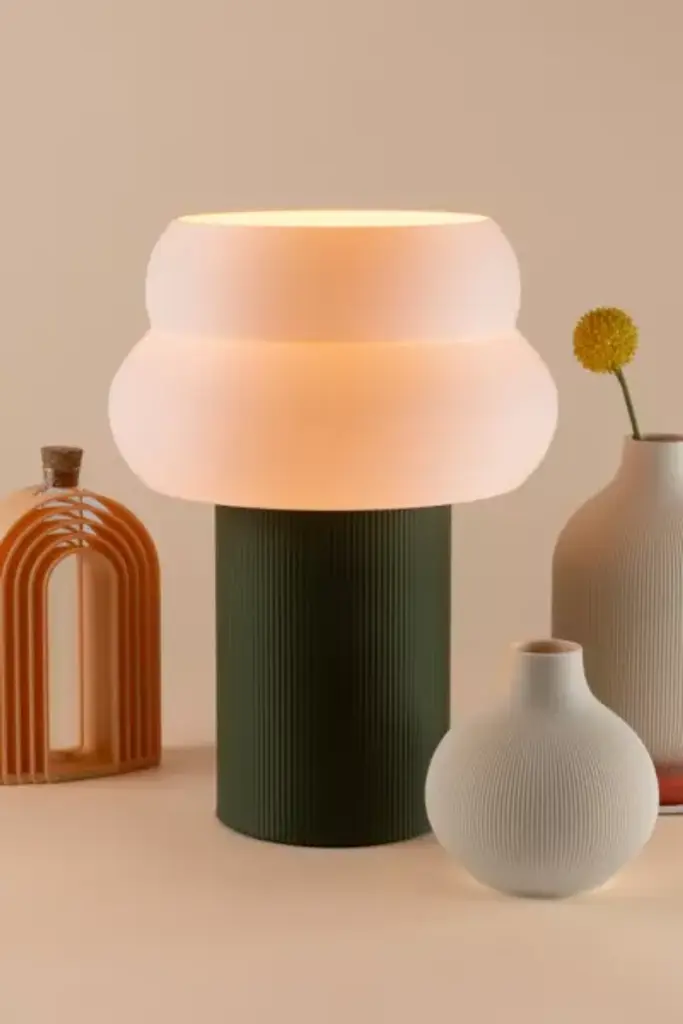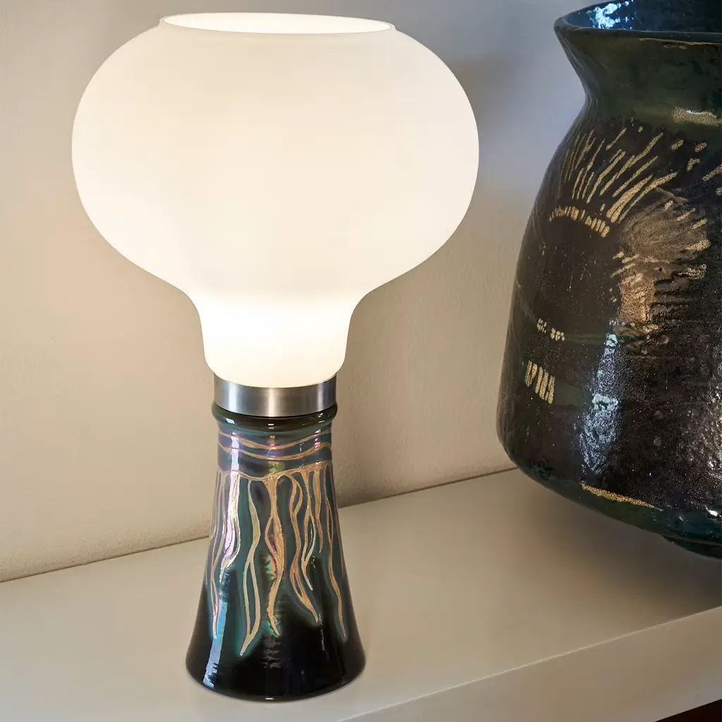 Iridescent flames envelop the flared faience body of this table lamp, a singular and superb design whose glimmers capture the eye even when the light is off. Topped by a bud-like opaline glass diffuser, where the lightbulb is nestled, the ceramic base owes its breathtaking shades to a specific technique in which luster and enamels are layered before undergoing a second reduction firing. Each piece is nan authentic artisan masterpiece.