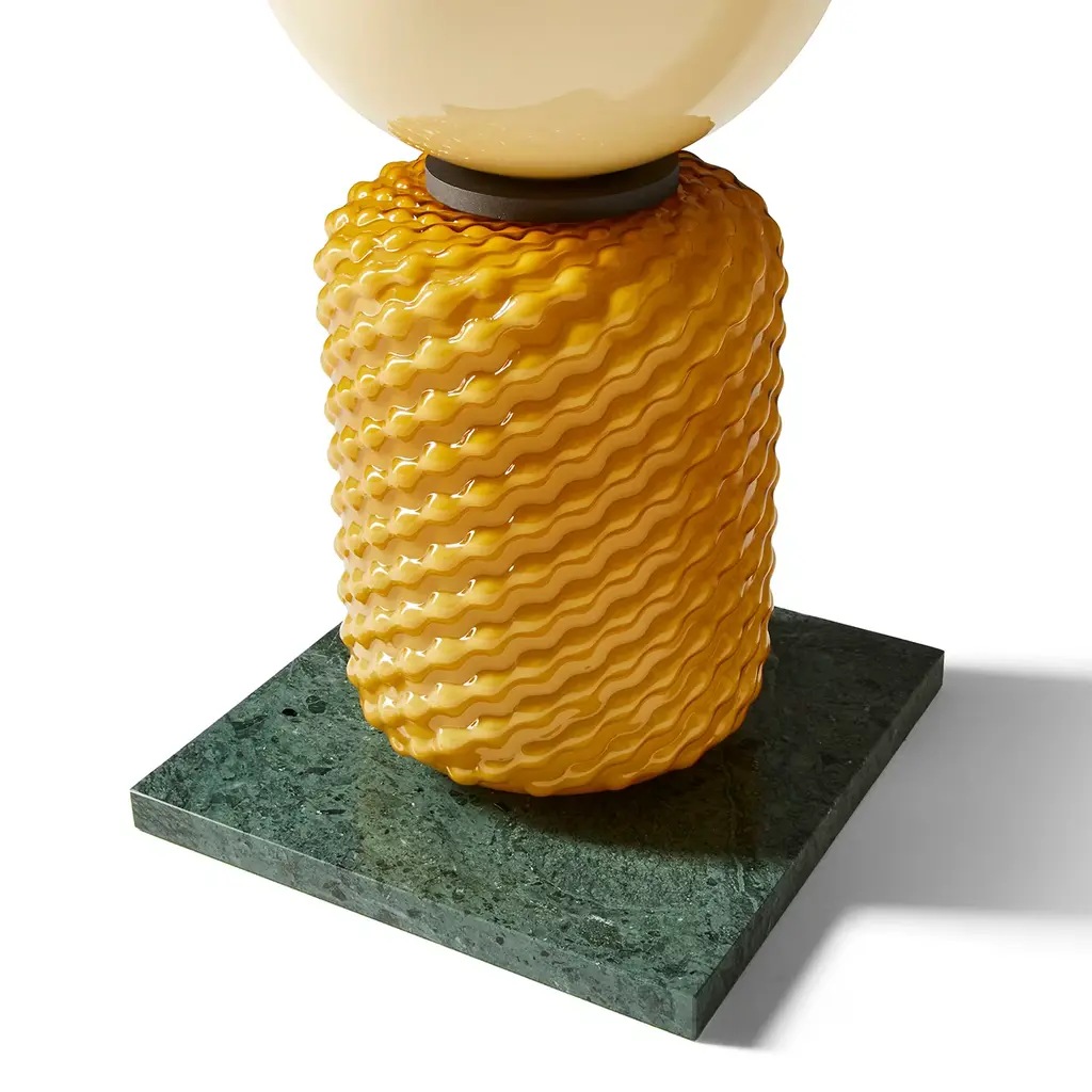 Ficupala stands out for its eclectic style, a cross between post-modernism and art deco, recalling the organic forms of the vegetable kingdom. The floor and table lamp is 138 cm or 59 cm high and comes with a fine Marquinia marble base and a blown glass diffuser and body available in different colors.