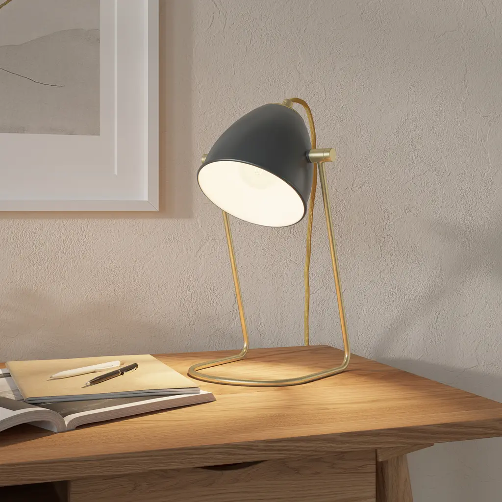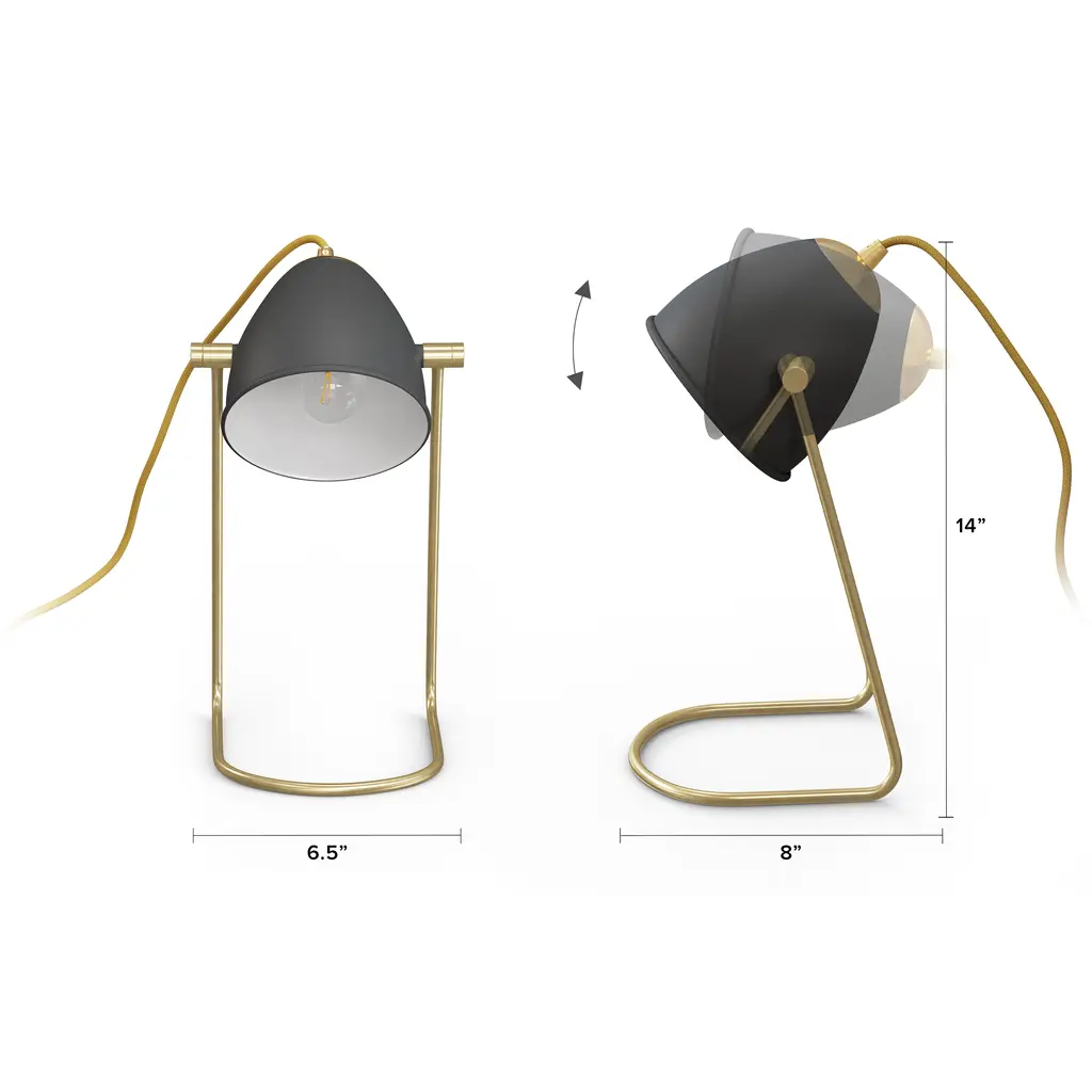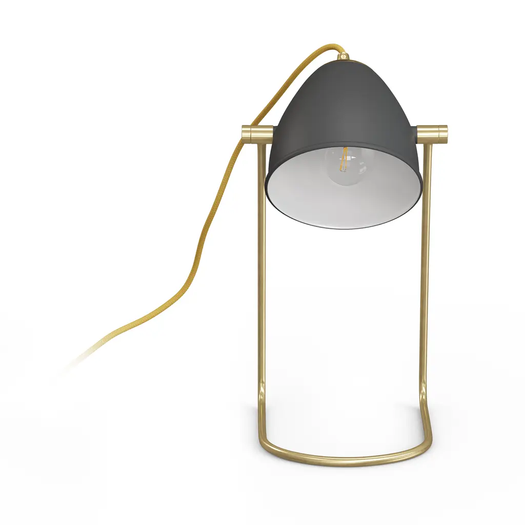 A table topping show stopper. The Fila table lamp features a powder-coated shade atop a spindly wire frame. Adjustable and with a small footprint, this lamp looks great on your bedside table, or on your desk as you burn the midnight oil.
