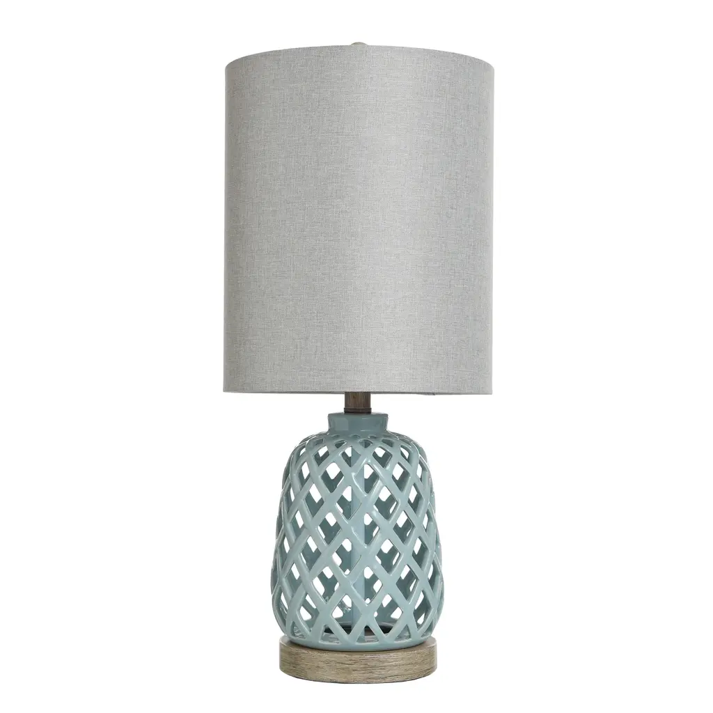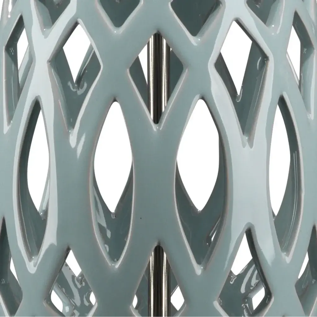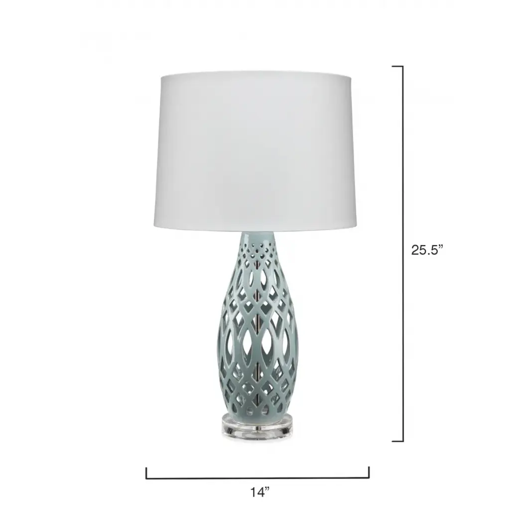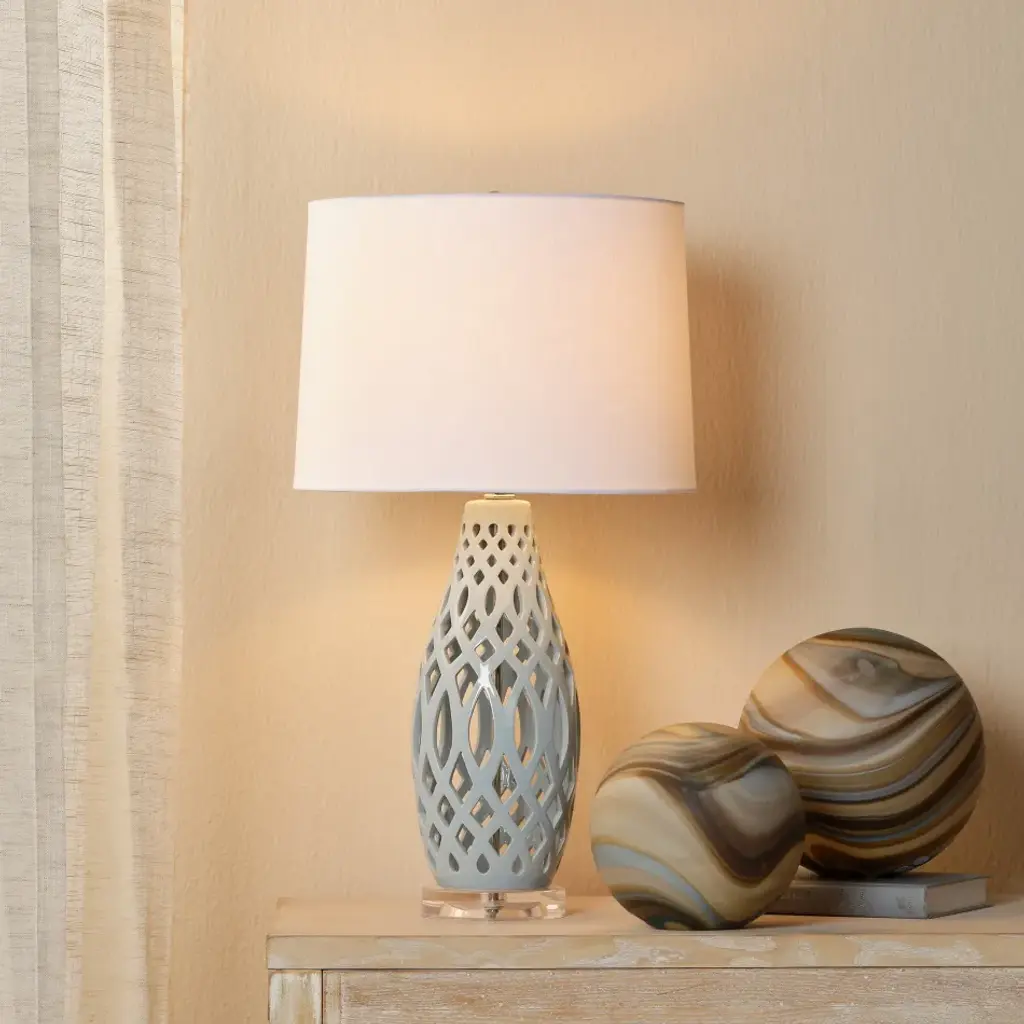 Handcrafted by skilled artisans, this ceramic table lamp features a woven filigree pattern that creates depth and dimension as light passes through. Placed on an acrylic clear base and anchored with a linen shade. Light and airy, breathe new life and illumination to a reading nook, nightstand, desk or entryway.