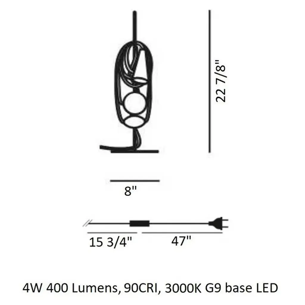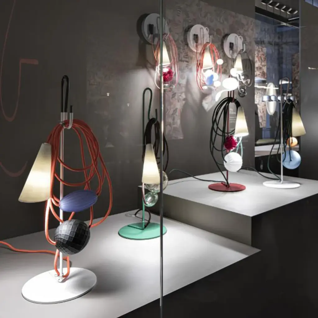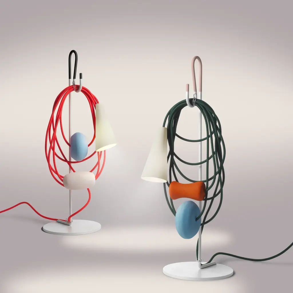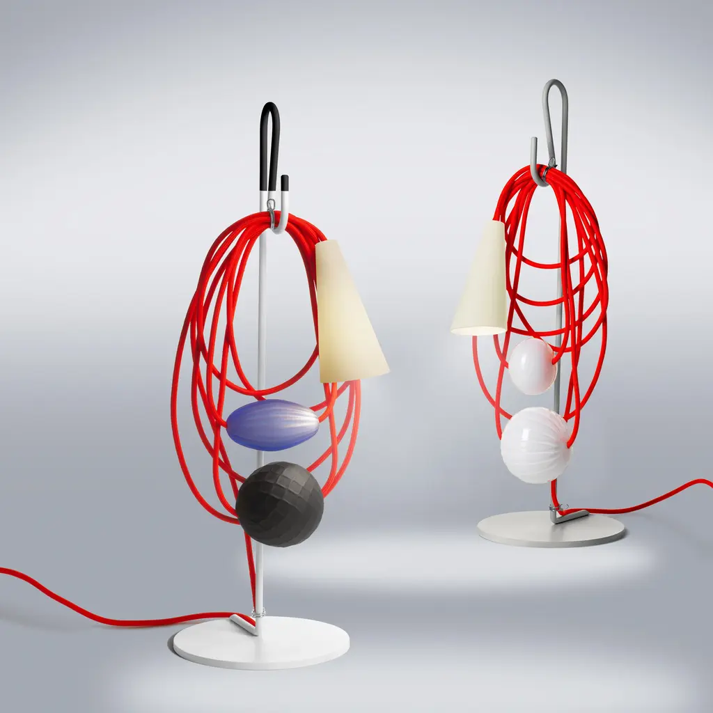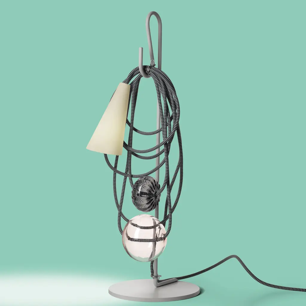 Filo comes from the desire to display the individual parts that go into a lamp – the light source, decoration and electrical wiring – bringing out their structural and aesthetic characteristics, simplifying the grammar and syntax. Its essential character is the result of the choice of using decoration to play a fundamental role, incorporating elements that are not traditionally considered decorative. Hence the electrical wire establishes a dialogue with the parts in glass and the diffuser, in a rhythmical game of role swapping. While the energy that allows the lamp to perform its purpose as lighting runs along the cord, spheres and bulbs of glass also take their place there, transforming it into the archetype of a necklace, with a porcelain body in the form of a cone that projects the light on the wire and the glass spheres, ideally positioned as a pendant. Table lamp with semi-diffused and direct down light. The base and the rod that support the cable and decorations are made of powder coated metal. The round electrical cable is covered with colored fabric, the ON/OFF switch on the cable is black, as is the plug. The two decorative elements are made of entirely hand-crafted mold-less hand-blown glass. The different shapes and decorations are conferred directly to the product during processing. The cone, which contains the retrofit LED lamp, its shape is obtained in a mold. The eight default versions differ in the color of the cable, and in the shapes and color of the glass elements and in the color of the base. Features