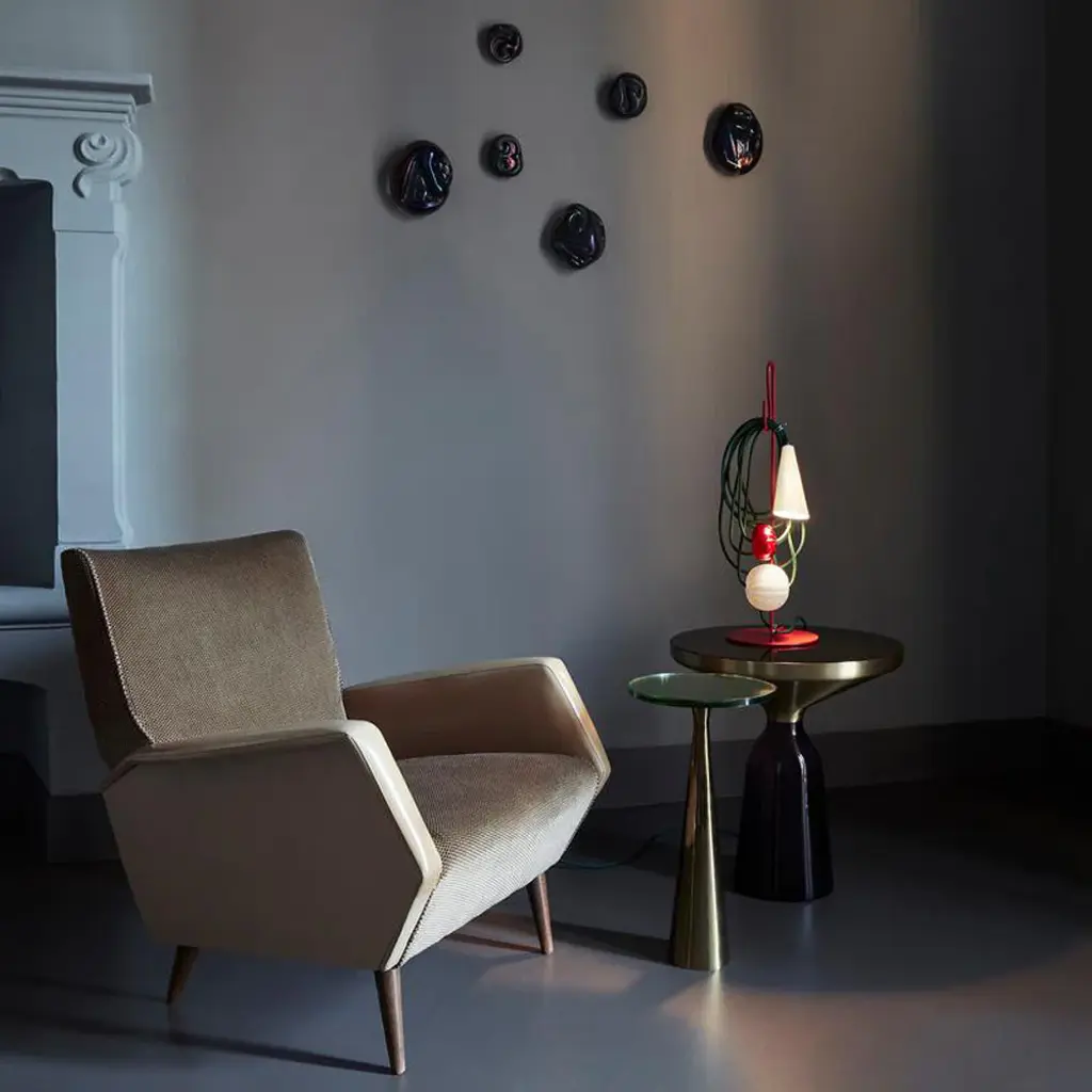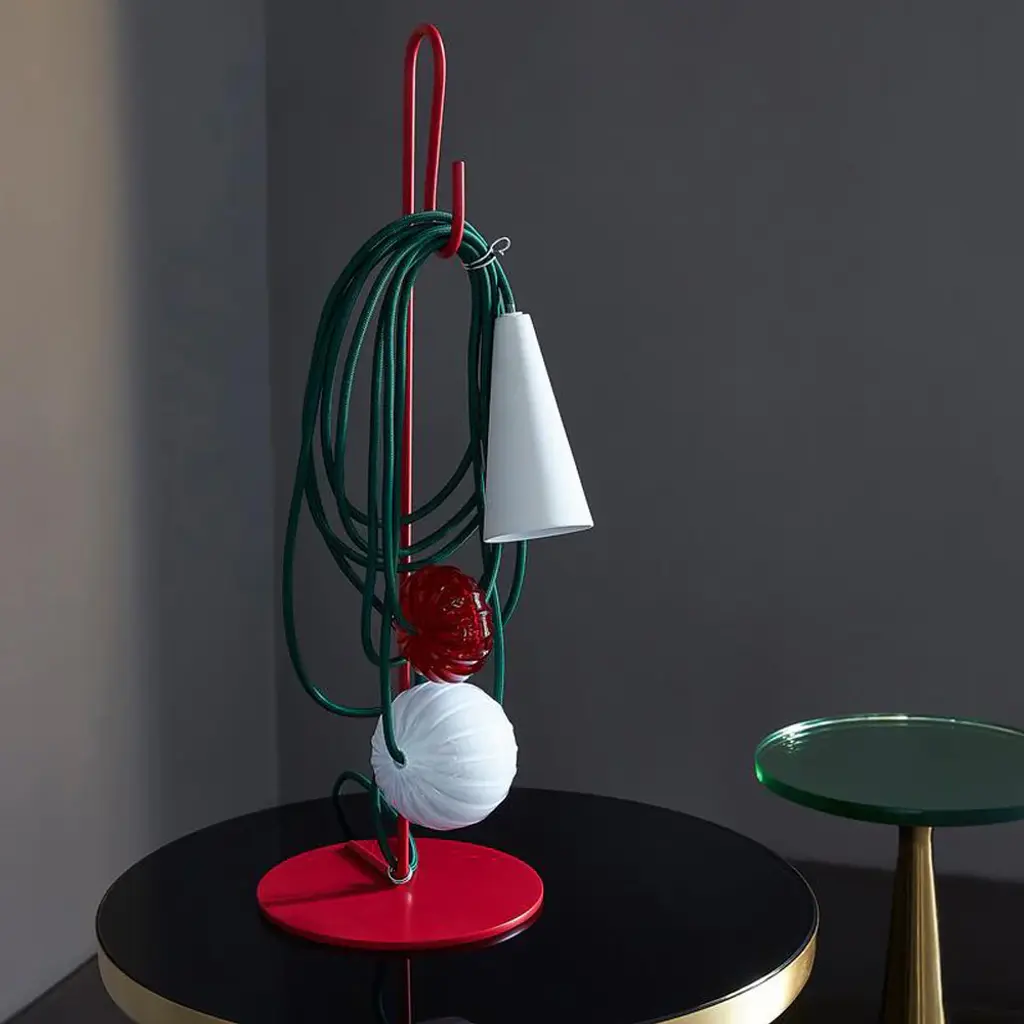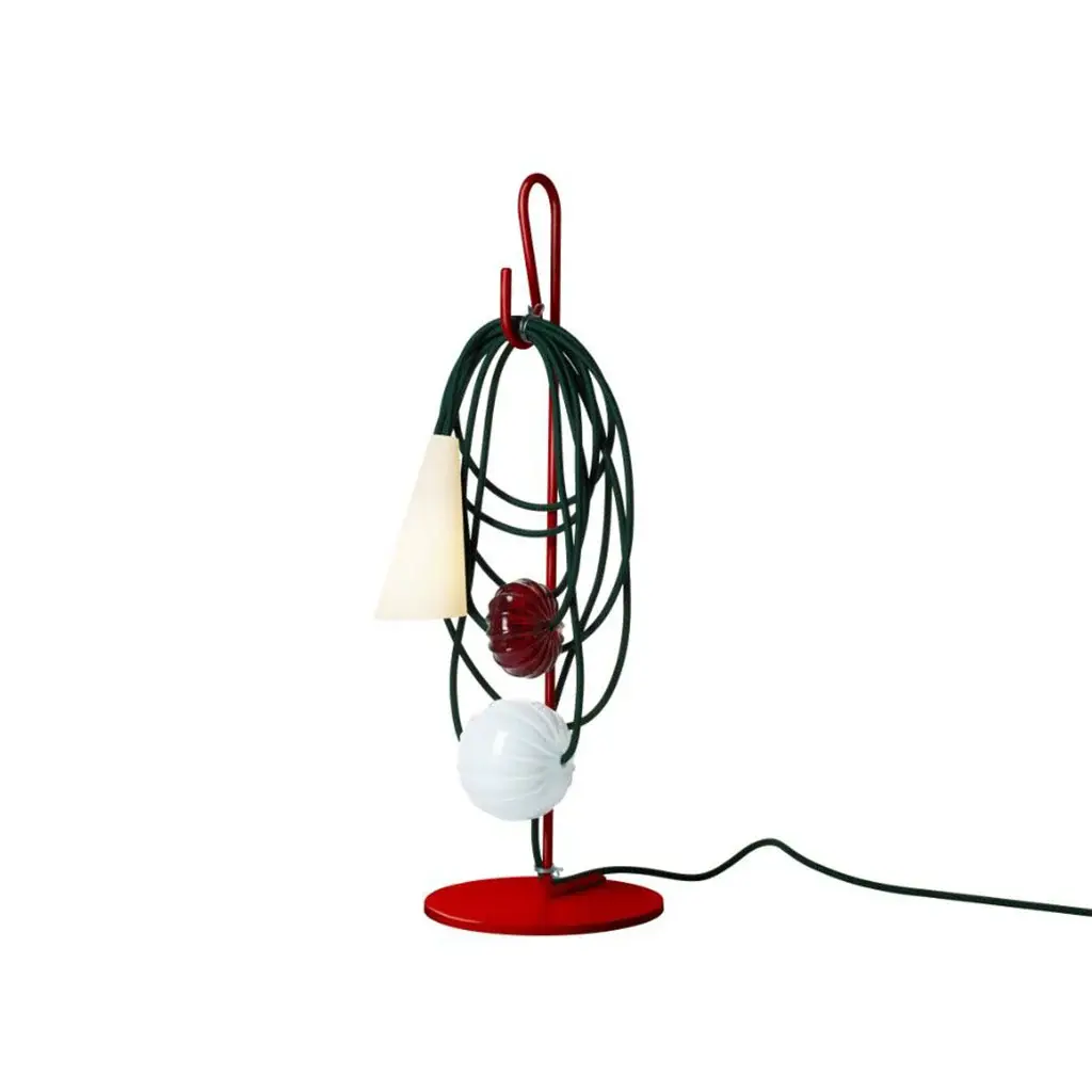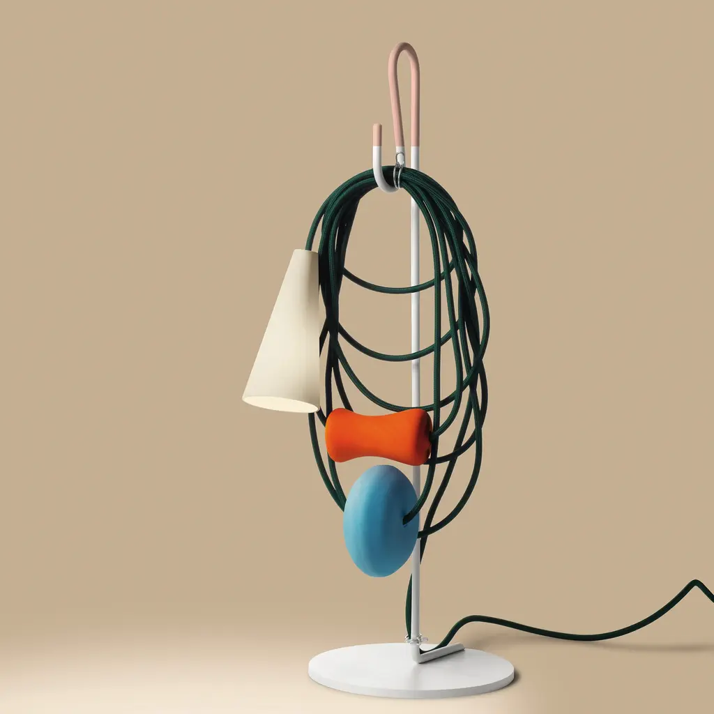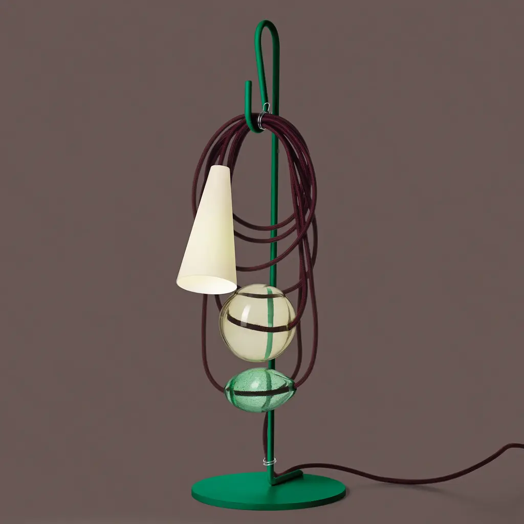 Filo comes from the desire to display the individual parts that go into a lamp – the light source, decoration and electrical wiring – bringing out their structural and aesthetic characteristics, simplifying the grammar and syntax. Its essential character is the result of the choice of using decoration to play a fundamental role, incorporating elements that are not traditionally considered decorative. Hence the electrical wire establishes a dialogue with the parts in glass and the diffuser, in a rhythmical game of role swapping. While the energy that allows the lamp to perform its purpose as lighting runs along the cord, spheres and bulbs of glass also take their place there, transforming it into the archetype of a necklace, with a porcelain body in the form of a cone that projects the light on the wire and the glass spheres, ideally positioned as a pendant. Table lamp with semi-diffused and direct down light. The base and the rod that support the cable and decorations are made of powder coated metal. The round electrical cable is covered with colored fabric, the ON/OFF switch on the cable is black, as is the plug. The two decorative elements are made of entirely hand-crafted mold-less hand-blown glass. The different shapes and decorations are conferred directly to the product during processing. The cone, which contains the retrofit LED lamp, its shape is obtained in a mold. The eight default versions differ in the color of the cable, and in the shapes and color of the glass elements and in the color of the base. Features