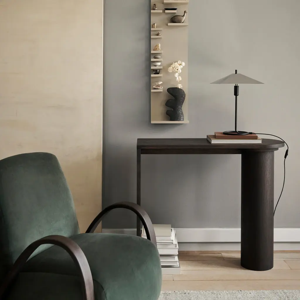 Characterised by its distinctive graphic lines and classic silhouette, the Filo Table Lamp is a timeless design piece. The architectural shape of the shade, combined with the white satin finish of the inside, beautifully reflects the light onto the table, making it ideal for a working situation at the desk. The Filo Table Lamp is available in various finishes to make room for personality.