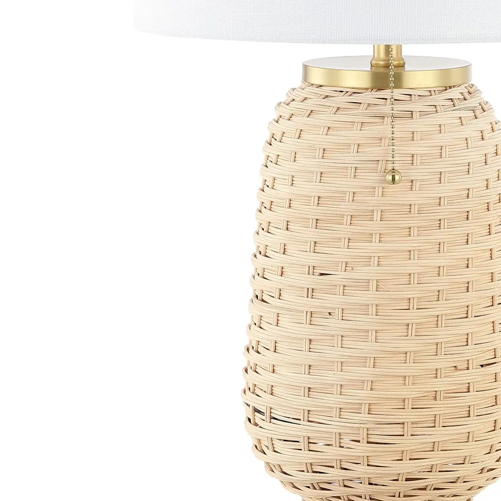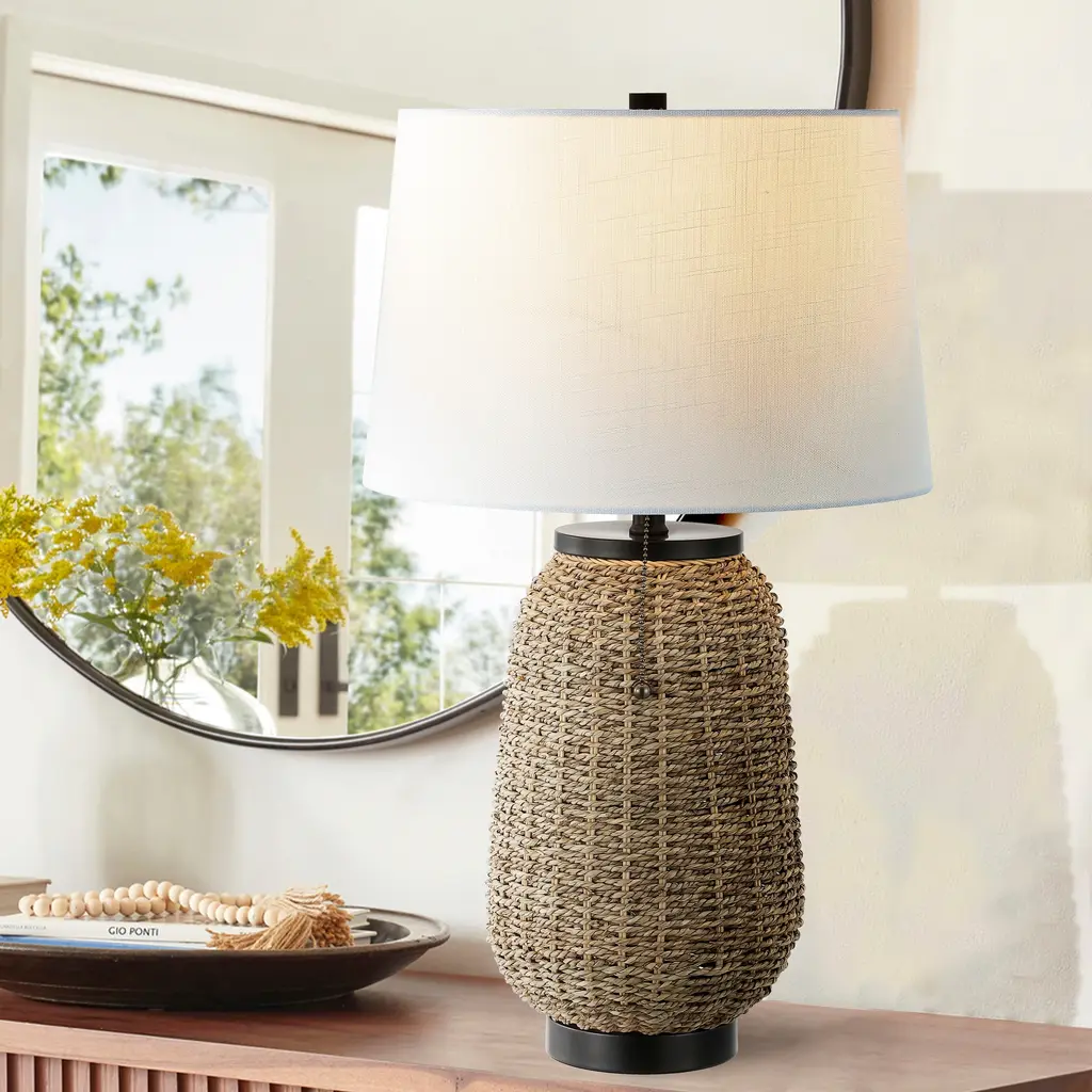 This seagrass lamp's natural texture will add tropical style to any interior. Give your bedroom, living room, or dining room console a vintage, Boho-chic look. Metal fittings and a linen hardback shade add traditional flair. Includes an energy-saving dimmable LED bulb.Features:Dimensions:About us:You see a lamp.We see a decorative work of art.A perfectly curved shade casts a dramatic shadow on a floor. Compatible with LED lightbulbs: as easy on the environment as they are on the eyes. The JONATHAN Y Lighting collection considers every detail from impeccably sourced materials to designer styling. And our prices are so attractive, we've transformed a functional necessity into a fashion accessory.JONATHAN Y Lighting - a fashion revolution in home decor.
