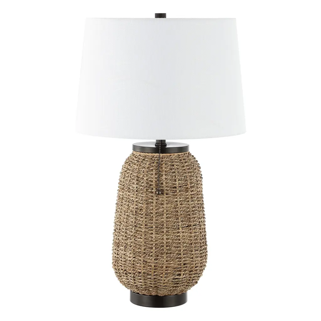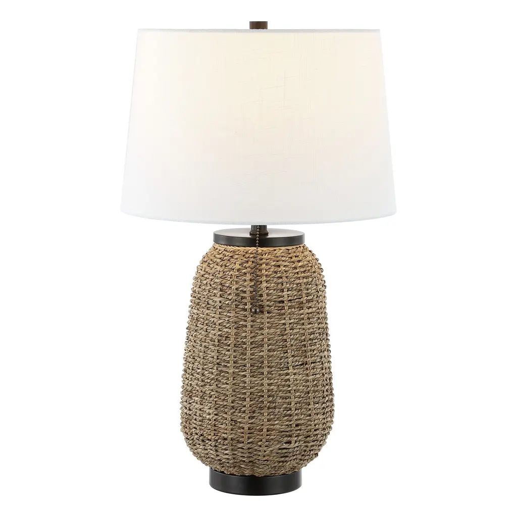 This seagrass lamp's natural texture will add tropical style to any interior. Give your bedroom, living room, or dining room console a vintage, Boho-chic look. Metal fittings and a linen hardback shade add traditional flair. Includes an energy-saving dimmable LED bulb.Features:Dimensions:About us:You see a lamp.We see a decorative work of art.A perfectly curved shade casts a dramatic shadow on a floor. Compatible with LED lightbulbs: as easy on the environment as they are on the eyes. The JONATHAN Y Lighting collection considers every detail from impeccably sourced materials to designer styling. And our prices are so attractive, we've transformed a functional necessity into a fashion accessory.JONATHAN Y Lighting - a fashion revolution in home decor.