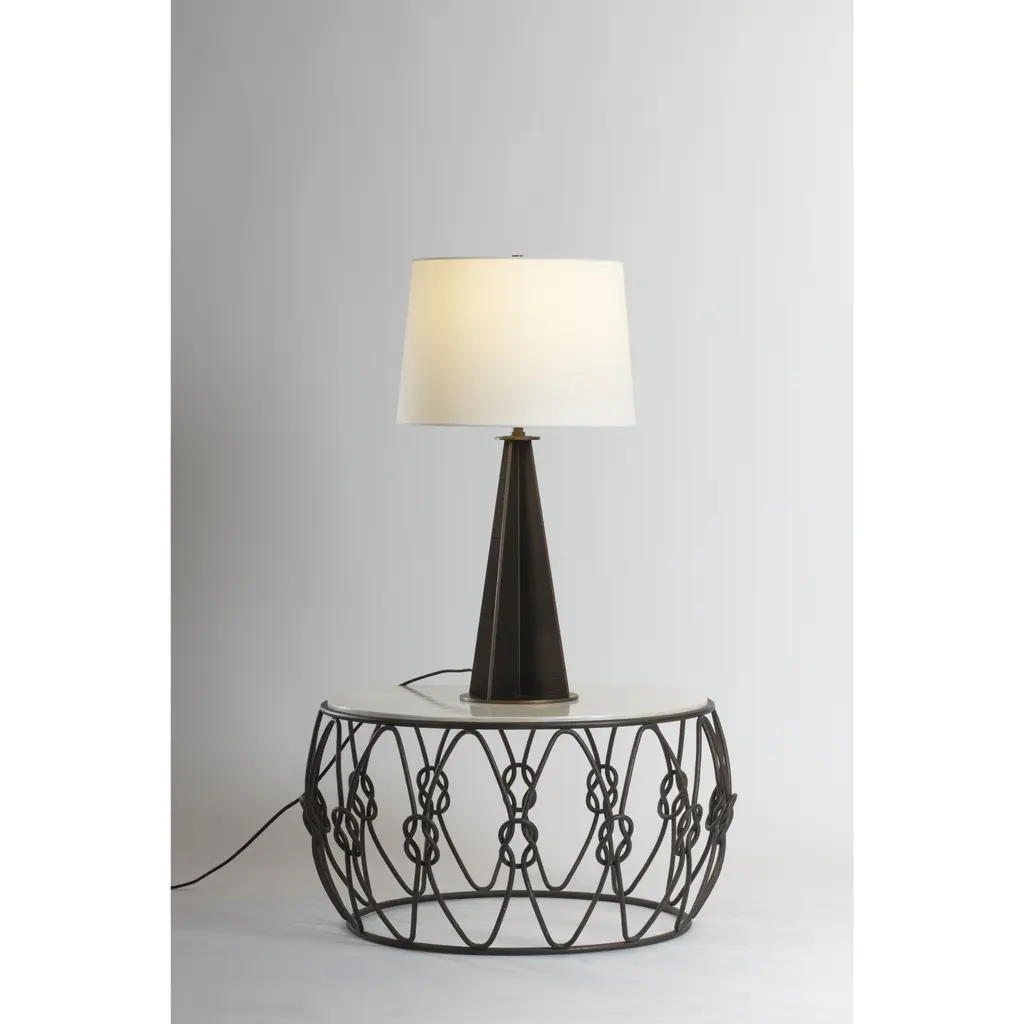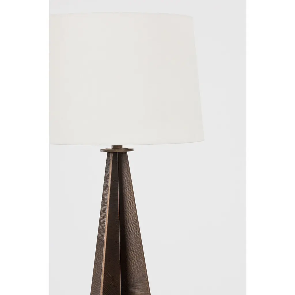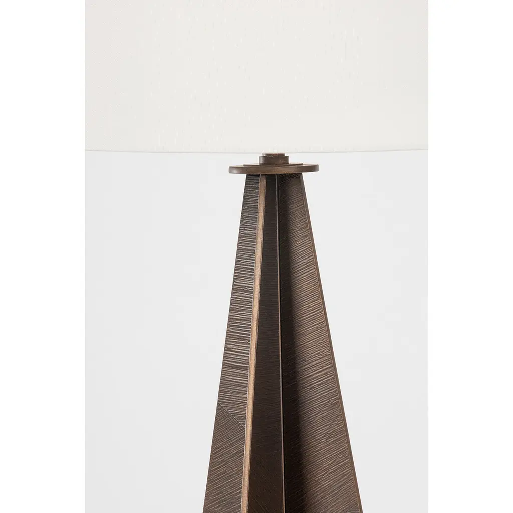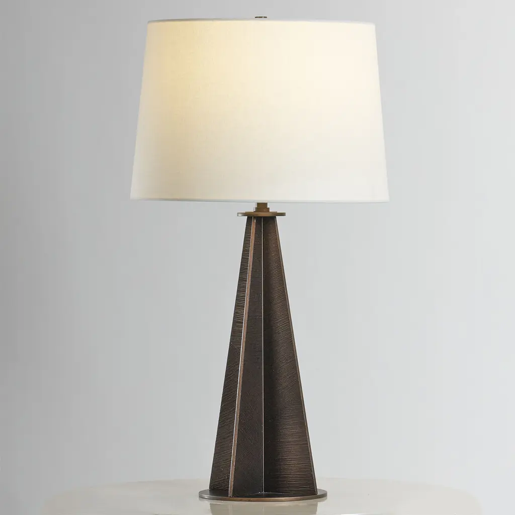 Finn is all about graphic linework and angular forms. The fin-shaped body of the lamp, created entirely from flat planes of metal, features a diagonal composition of textures, which are debossed into the surface. The Bronze Leaf finish is complemented by the grained Off-White Linen shade, adding to the overall rustic nature of the fixture.