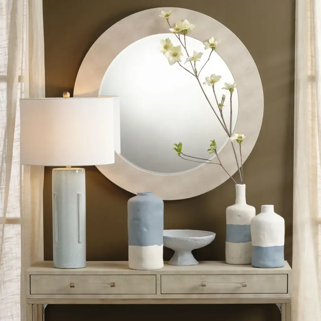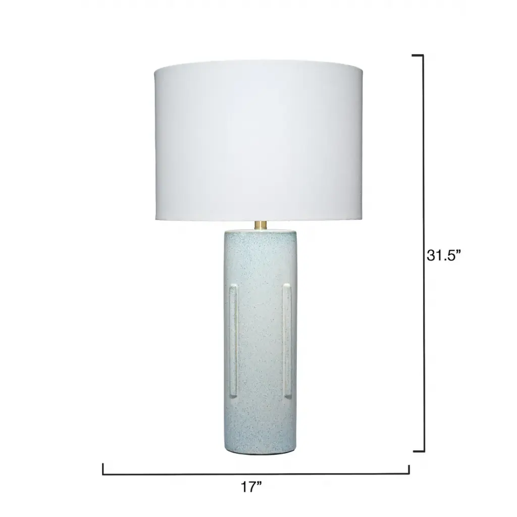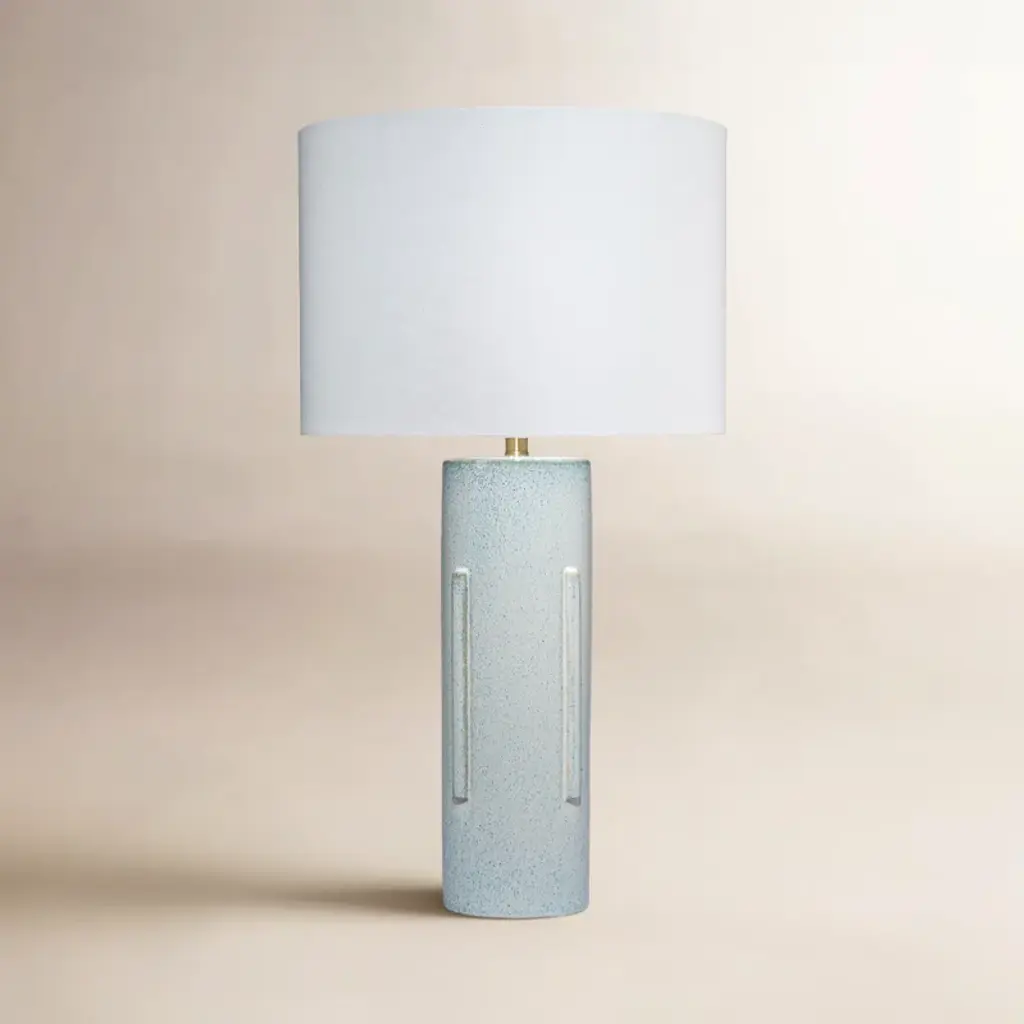 Finished in a gradient blue reminiscent of robin’s eggs and seafoam, this serene ceramic lamp is topped with a clean white linen drum shade. The inviting palette is continued with a silver-toned ball finial, harp, and spider. Somehow managing to be both cozy and sophisticated, it is perfect next to a white couch or in an entryway.