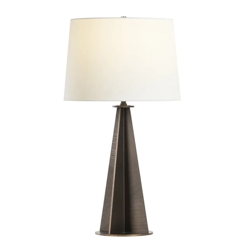 The Finn Table Lamp from Troy Lighting is an homage to graphic linework and angular forms. This lamp has a distinctive design language with a fin-shaped body crafted from flat metal planes. The surface features a captivating diagonal composition that creates a dynamic and engaging piece. The lamp's iron and steel body lend a robust yet refined quality, while the off-white linen shade adds understated elegance. The result is a stunning synthesis of Art Deco influences and contemporary aesthetics.