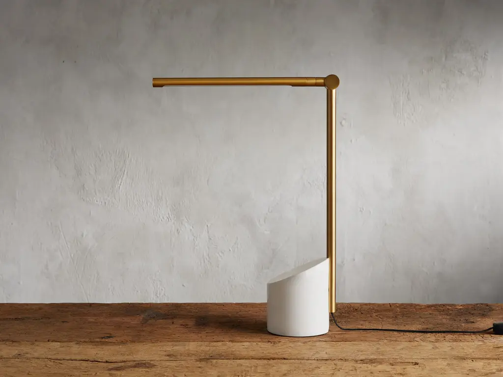 Featuring a chic modern aesthetic and practical functionality with integrated LED dimmer lights, our Finnegan Task Lamps will accentuate your work or living space with a warm, brass finish, Italian white marble base, and minimalistic design.