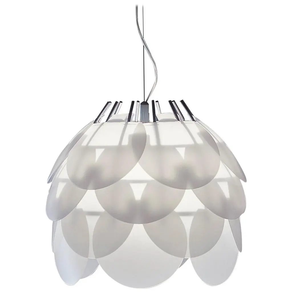 The Slamp Fiorella Chandelier explores the intrigue of puzzles through creative lighting design. Several fins of various shapes and densities clip into a central core for a design that is unique. The Fiorella Collection also includes table lamps and chandeliers for a contemporary outdoorsy look.