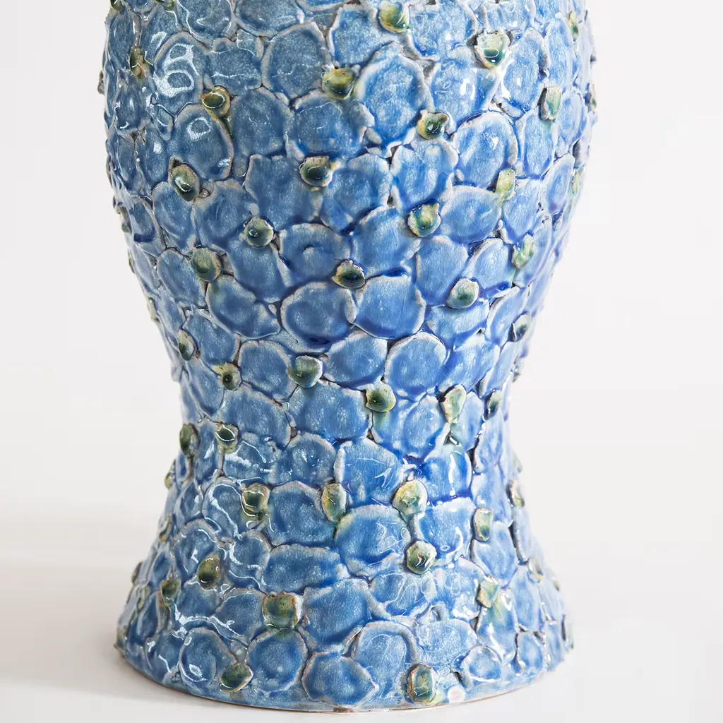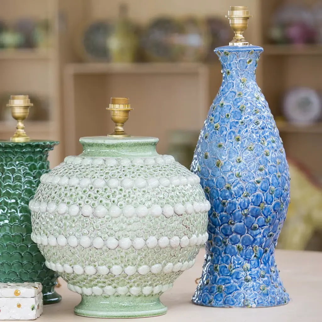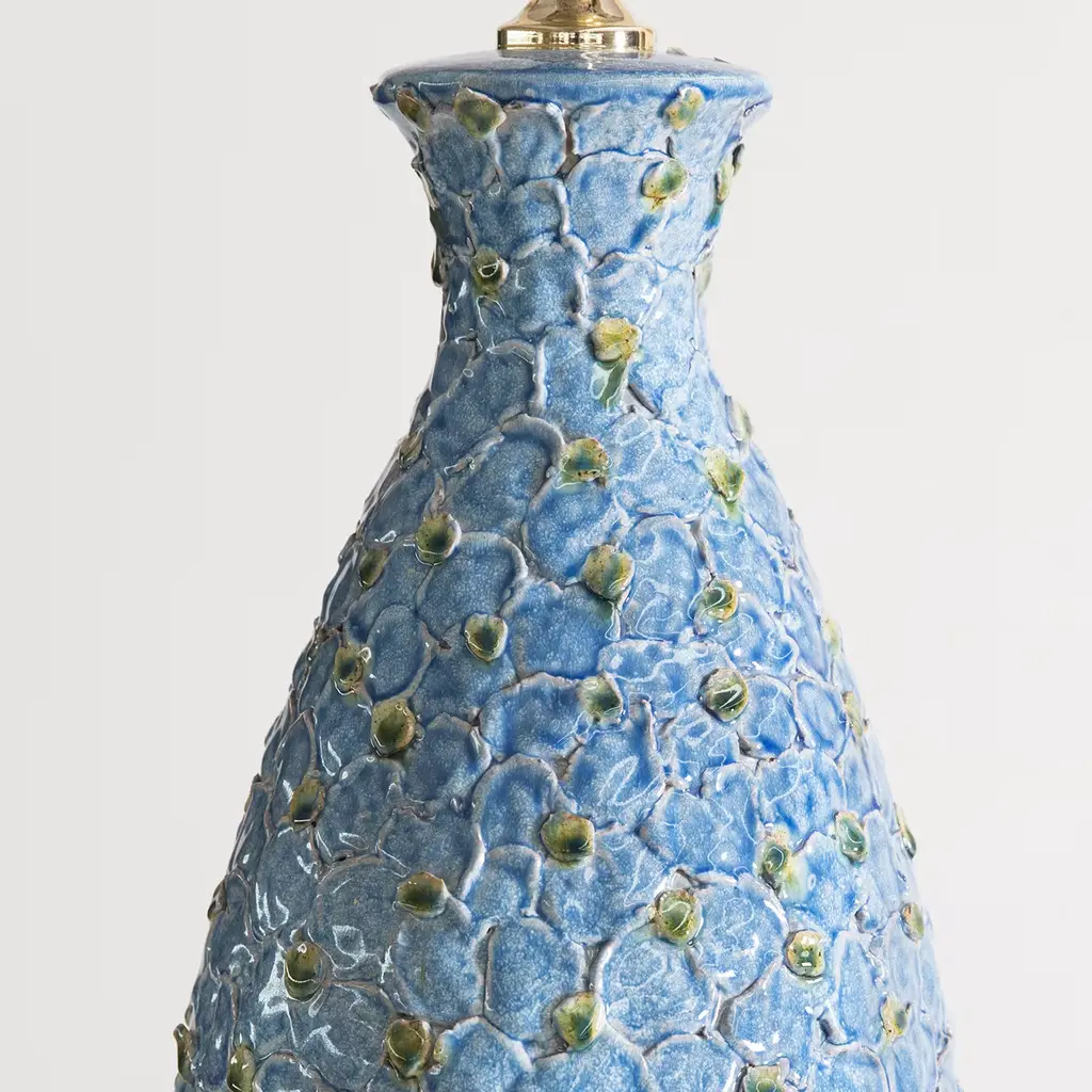 Maiolica table lamp consummately handcrafted by the master potters of the Tuscan ceramic atelier ND Dolfi. This elegant lamp is characterized by the relief pattern of light blue flowers running uninterruptedly throughout the maiolica piece. Lampshade not included, available on request.