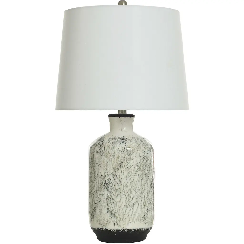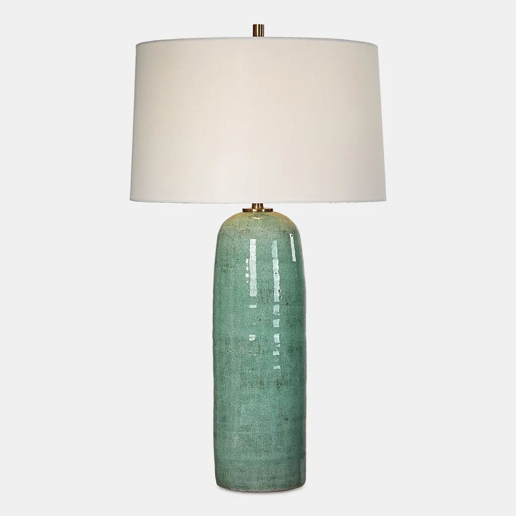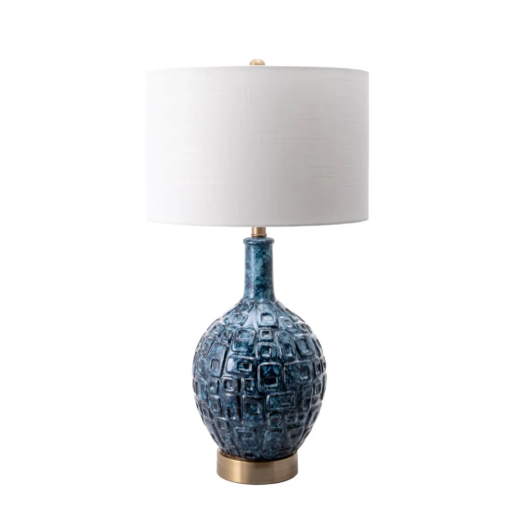 Maiolica table lamp consummately handcrafted by the master potters of the Tuscan ceramic atelier ND Dolfi. This elegant lamp is characterized by the relief pattern of light blue flowers running uninterruptedly throughout the maiolica piece. Lampshade not included, available on request.