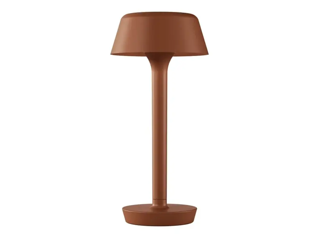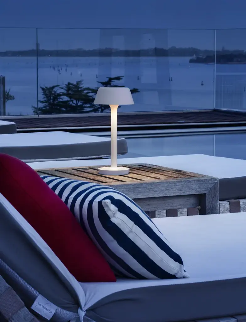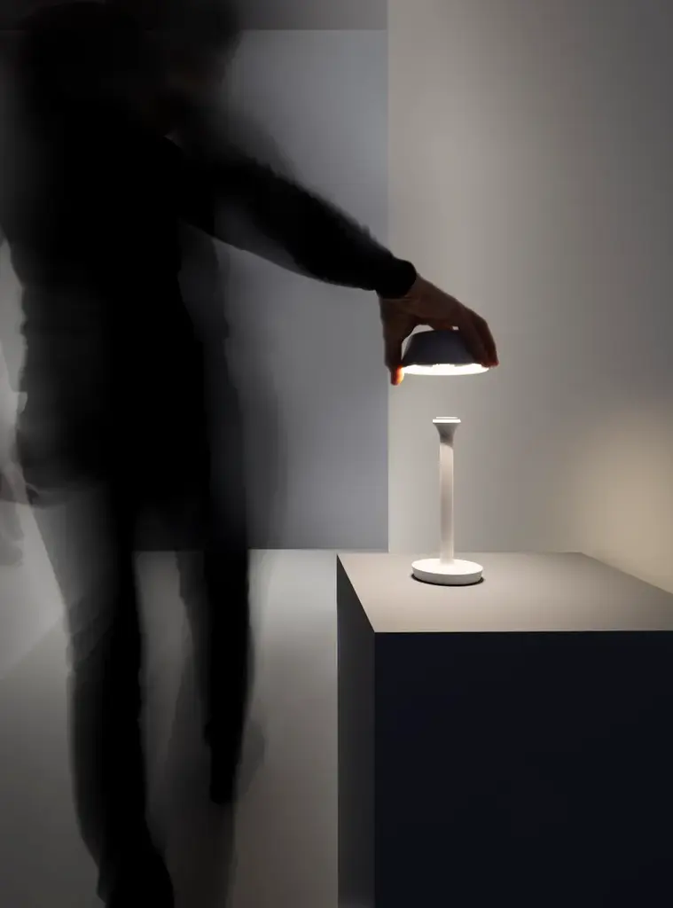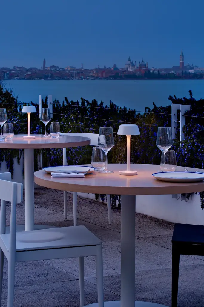 FIREFLY IN THE SKY is an outdoor and indoor battery table lamp with LED. Table lighting fixture for indoor or outdoor spaces, with direct light emission.Die-cast aluminium bearing base in polyacrylic paint.Body in brass and aluminium in champagne, mat black, corten, bronze, textured olive green, textured soft white and textured natural terracotta polyacrylic paint.Removable head with magnetic fastening, in die-cast aluminium with polyacrylic paint.Silicone gaskets.Modelled acrylic diffuser with mat finish and serigraphy.Stainless steel screws.Push-button to adjust luminosity according to 5 levels of visual comfort.Battery status indicator integrated into the head.Equipped with Li-Po battery USB-C rechargeable, with up to 6 hours life at 100% of light emission and up to 24 hours life at 25%.Equipped with battery charger with USB-C connector and adapter plug.Firefly in the sky is a battery table lamp. The removable head contains magnetic coupling system, rechargeable battery via USB-C, LED source and Step DIM control with 5 light intensity settings. Depending on the conditions of use for a recharge of approximately 4 hours, an autonomy of approximately 6 hours is estimated with 100% light intensity and approximately 24 hours with 25% light intensity. Anti-slip base included. Textured olive green, textured soft white, textured natural terracotta and corten are added to mat black, bronze and champagne finishes available.