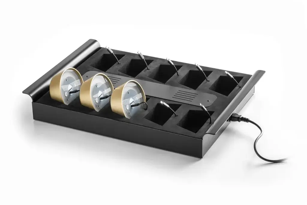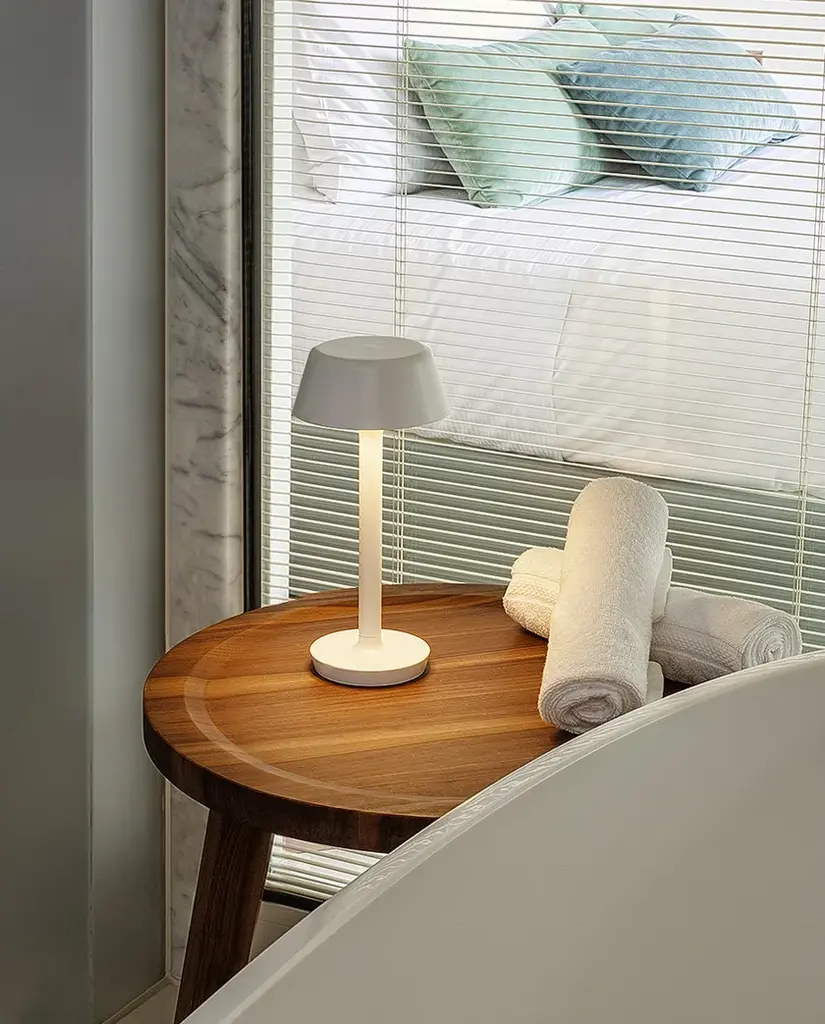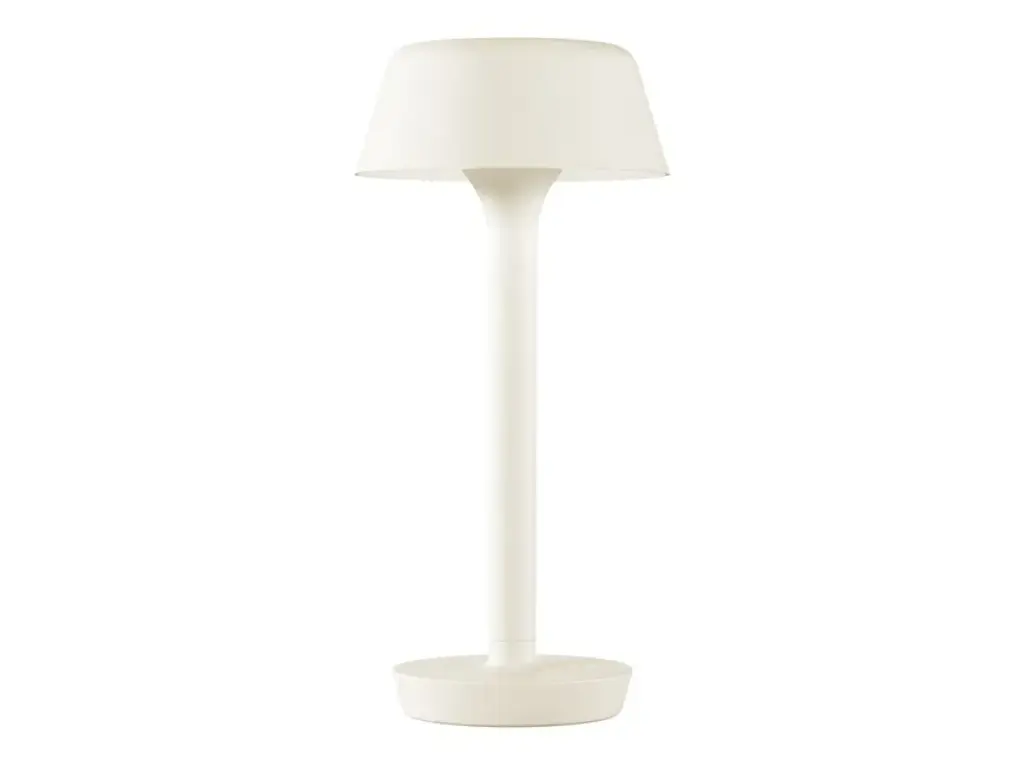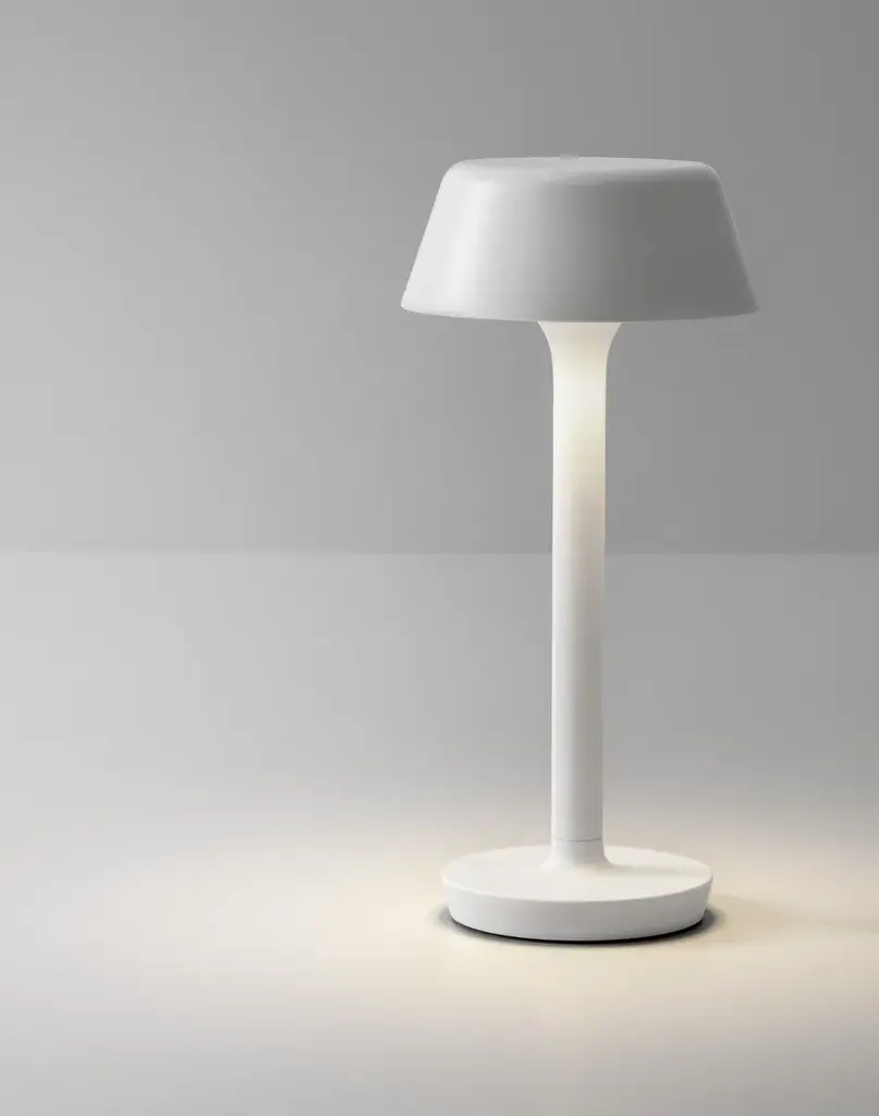 FIREFLY IN THE SKY is an outdoor and indoor battery table lamp with LED. Table lighting fixture for indoor or outdoor spaces, with direct light emission.Die-cast aluminium bearing base in polyacrylic paint.Body in brass and aluminium in champagne, mat black, corten, bronze, textured olive green, textured soft white and textured natural terracotta polyacrylic paint.Removable head with magnetic fastening, in die-cast aluminium with polyacrylic paint.Silicone gaskets.Modelled acrylic diffuser with mat finish and serigraphy.Stainless steel screws.Push-button to adjust luminosity according to 5 levels of visual comfort.Battery status indicator integrated into the head.Equipped with Li-Po battery USB-C rechargeable, with up to 6 hours life at 100% of light emission and up to 24 hours life at 25%.Equipped with battery charger with USB-C connector and adapter plug.Firefly in the sky is a battery table lamp. The removable head contains magnetic coupling system, rechargeable battery via USB-C, LED source and Step DIM control with 5 light intensity settings. Depending on the conditions of use for a recharge of approximately 4 hours, an autonomy of approximately 6 hours is estimated with 100% light intensity and approximately 24 hours with 25% light intensity. Anti-slip base included. Textured olive green, textured soft white, textured natural terracotta and corten are added to mat black, bronze and champagne finishes available.