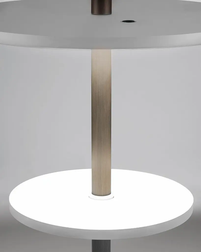Artifice for the “indirect transport of light”. Three disks interact on a vertical axis: the manual positioning of the middle one generates endless combinations of reflected light structures. The direct light thrown by a thin surface is reflected and controlled according to a precise geometric sequence of the composition.In 2000 Filippo Pagliani and Michele Rossi founded in Milan Park Associati. Listening, Experimentation, Complexity and Narration mark the architecture and design culture of the studio and the constantly changing yet highly distinctive stylistic approach reflects the open, transversal and scientific attitude of the two partners and their collaborators. The continuous search for new ways to combine materials and their forms with various technologies and functionalities gives Park Associati the opportunity to offer original solutions to the ever-changing requirements of clients and to dialogue with different environments while covering a broad range of activities, from product design to urban planning. Urban regeneration and the restyling of modern buildings have been the studio’s focus in recent years, from refurbishments in the Milan area of “La Serenissima” or “Gioiaotto” to recent projects in Piazza Cordusio and in Via Chiese.Additional Information: Color: White, Cable is black fabric; Materials: Varnished aluminium structure with Brass stem and Leather handle; Purpose: The lamp is indoor use only; Light Source: LED Boards; Wattage: 12W direct; Voltage: 24 V indirect; Lumen: 1190; Cri: 80; Kelvin: 2700; Dimension: is 295 x 550 mm. (Cable is 200cm)