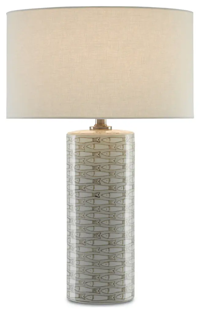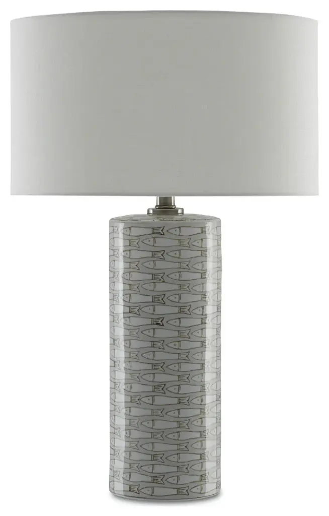 The Fisch Large Table Lamp has a fish pattern on the clean-lined porcelain column in gray and white. The antique nickel finish on the hardware echoes the tones in the glazing. We''ve topped the gray lamp with an off-white linen shade. We also have a smaller, more rotund version of the Fisch.Number of Lights: 1Type of Bulb: A StandardBulb Wattage: 150Bulbs Included: No