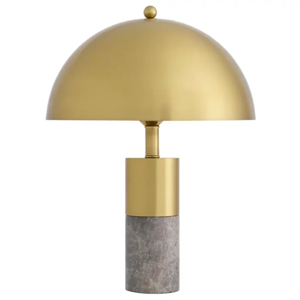 Make a memorable addition to indoor illumination with the smooth style and clever contrasts of the Flair Table Lamp from Eichholtz. This elemental assembly of stone and metal starts with a smooth cylindrical base in grey marble with polished, natural imperfections, capped by an equal-diameter metal top, which extends a robust stem upward to powerful lamping seated beneath a dome shade of the same metal. A small sphere finial keeps the shade in place, blunting bright glare to the sides and casting a mix of reflected warmth and a wash of direct downlight through the open base of the shade.