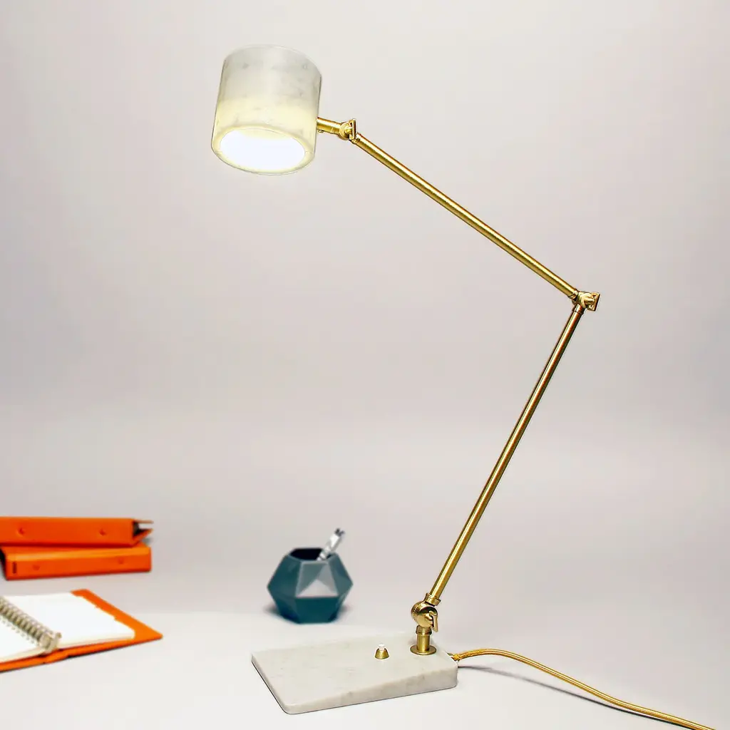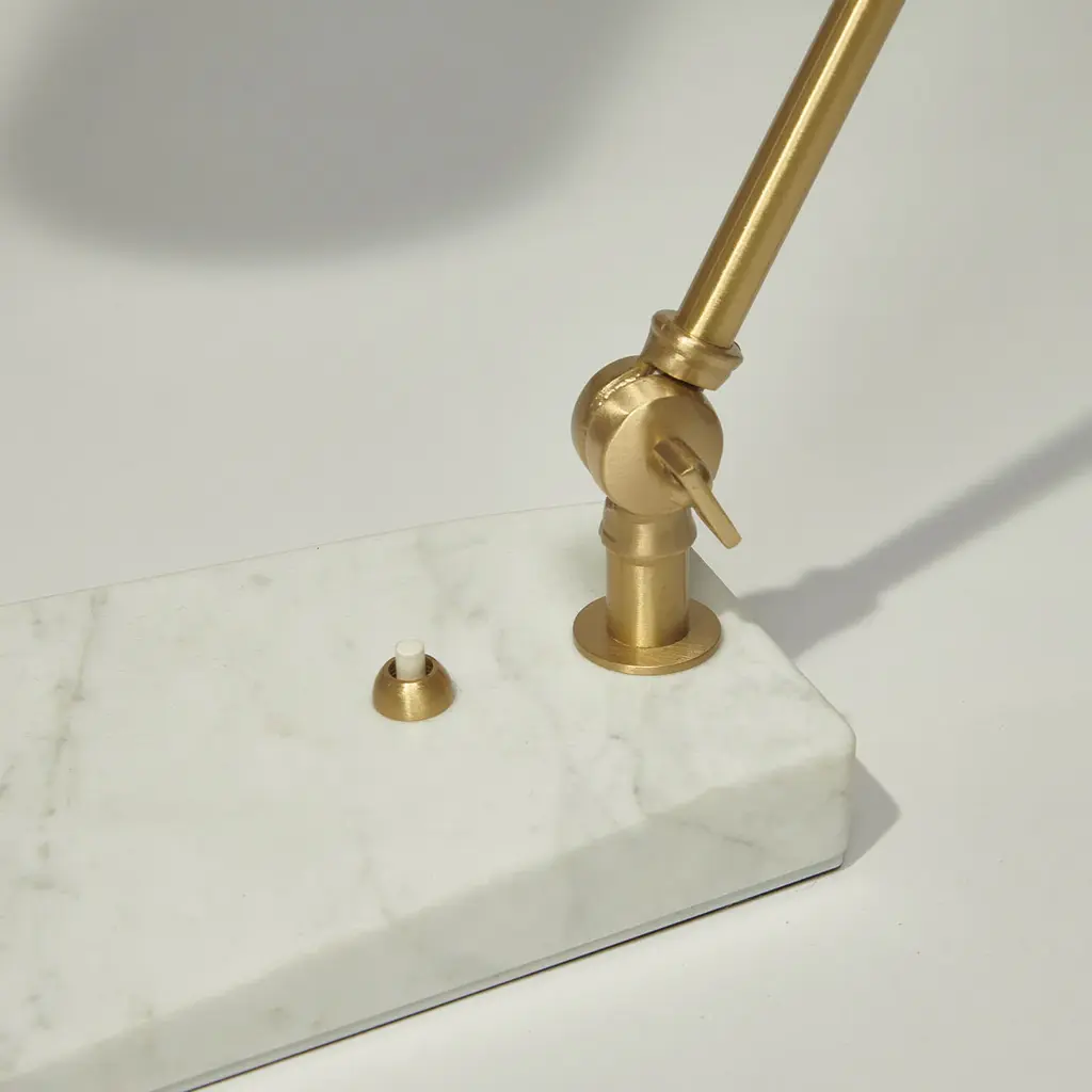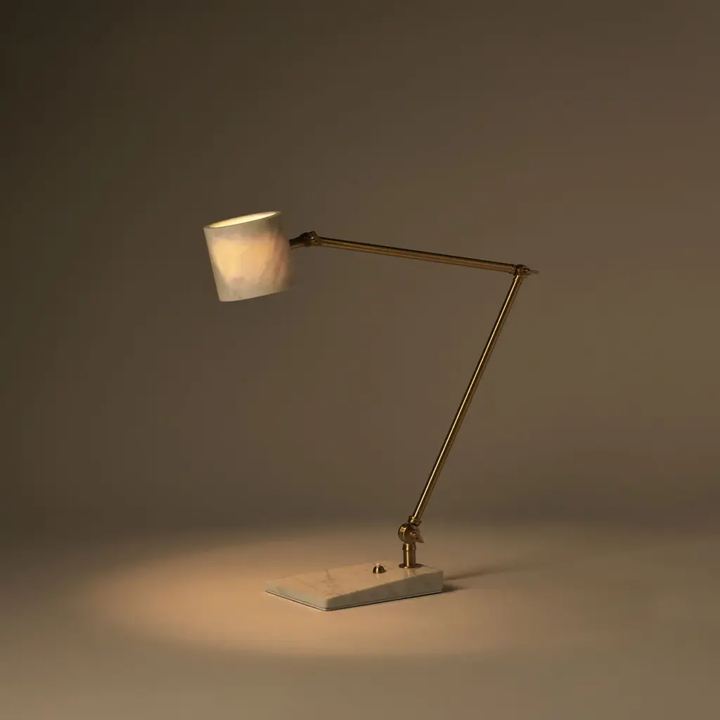 The Flamingo desk lamp is characterized by the contrast between the volumes of its elements: the thinness of the adjustable angle brass arm contrasts with the unusual adjustable marble shade.