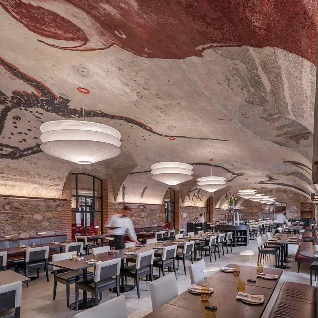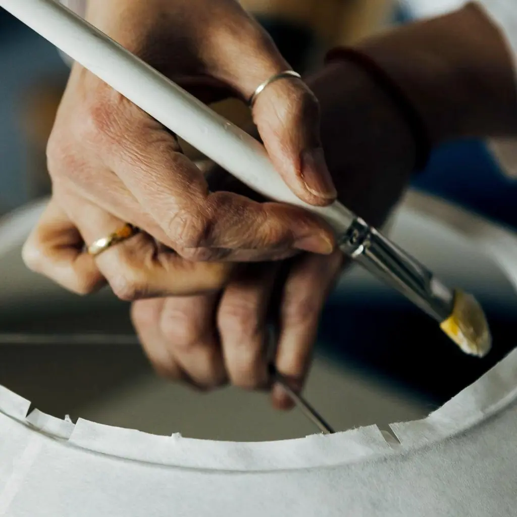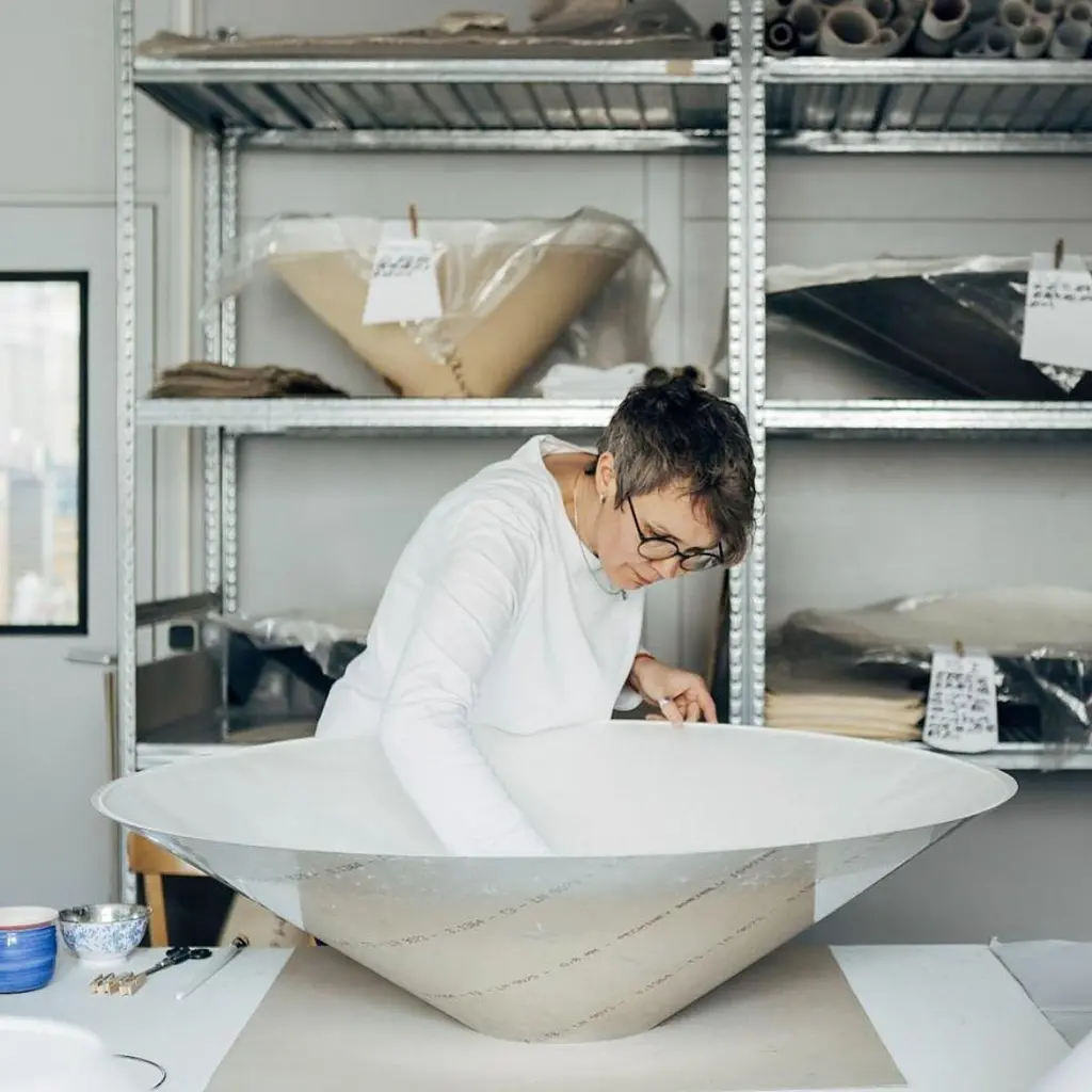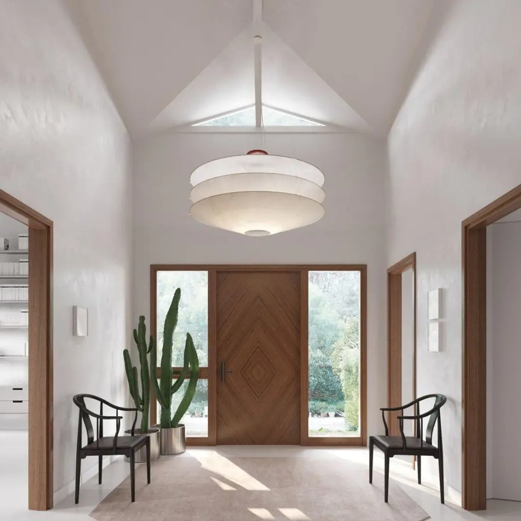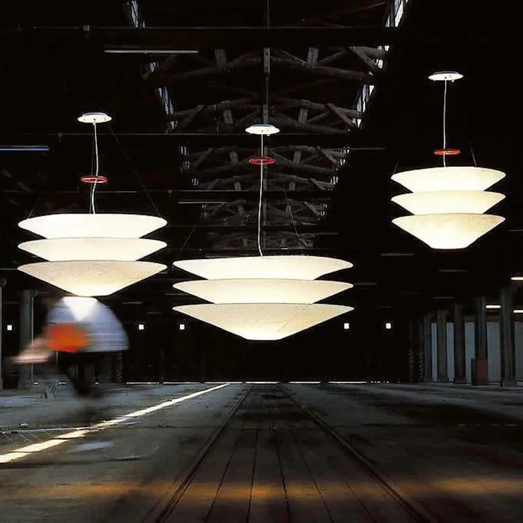 'Floatation' Japanese paper suspension lamp for Ingo Maurer.Designed and produced by Ingo Maurer, one of the most celebrated German lighting icons since 1966. With imagination, creativity and technical prowess, Maurer’s lamps have been explicitly designed to “stimulate the imagination and excite the emotions.” Today his Munich workshop continues to craft incomparable creations true to the one of a kind spirit of the firm’s founder.The ‘Floatation' originally designed in 1980, effortlessly provides a warm, diffused and calming light through three shades of purposely crinkled Japanese paper nested within each other. The lamp's length is adjusted by raising or lowering the counterweight, an iron ring executed in red enamel. Hand fabricated with thoughtful attention to detail, use of high quality materials and incomparable craftsmanship. Price per item. Available in unlimited quantities and in 3 diameters, this listing is for the medium 'Floatation.' Please see our separate listings for the small or large 'Floatation.'2x lamps in stock and available for immediate fulfillment. Out of stock can add 8 weeks or more. Please note that inventory availability can change without notice. For time-sensitive orders please contact us for current inventory and lead time prior to purchasing. Accommodates 5x standard medium base e26 LED bulbs (not included). 2x maximum 60Watt Equivalent, 2x maximum 40WE, 1x maximum 100WE, lower with incandescent. Dimmable according to bulb. Recommended LED Tala bulbs available separately, please inquire. Suspended from metal canopy by 3 metal wires providing an adjustable overall height of 64-79". Longer custom drops available for an additional cost & lead time. Not UL listed, but recommended UL listing possible from an authorized 3rd party vendor for an additional fee. Contact us to facilitate.Made to order. All sales are final.