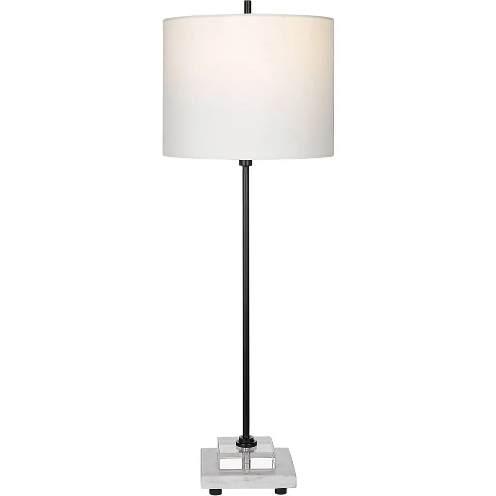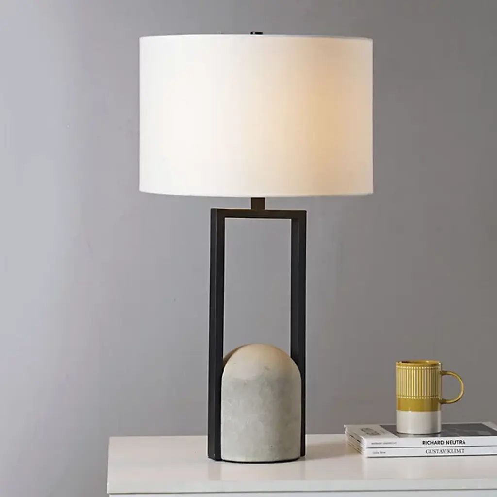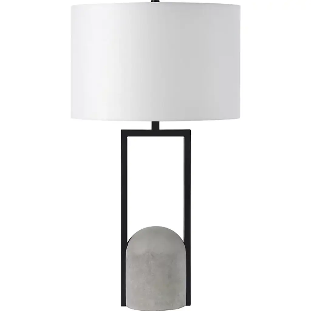 The Florah Table Lamp from Renwil is a harmonious presence in the room, bringing contrasting materials together like a minimalist sculpture. The clean outlines of the piece resonate with both modern and contemporary spaces. The piece’s concrete dome base adds a relaxing natural accent. An angular iron structure beautifully frames the concrete’s curves. On top, lamping stays hidden from sight behind a classic cotton shade for a glare-free ambient glow.