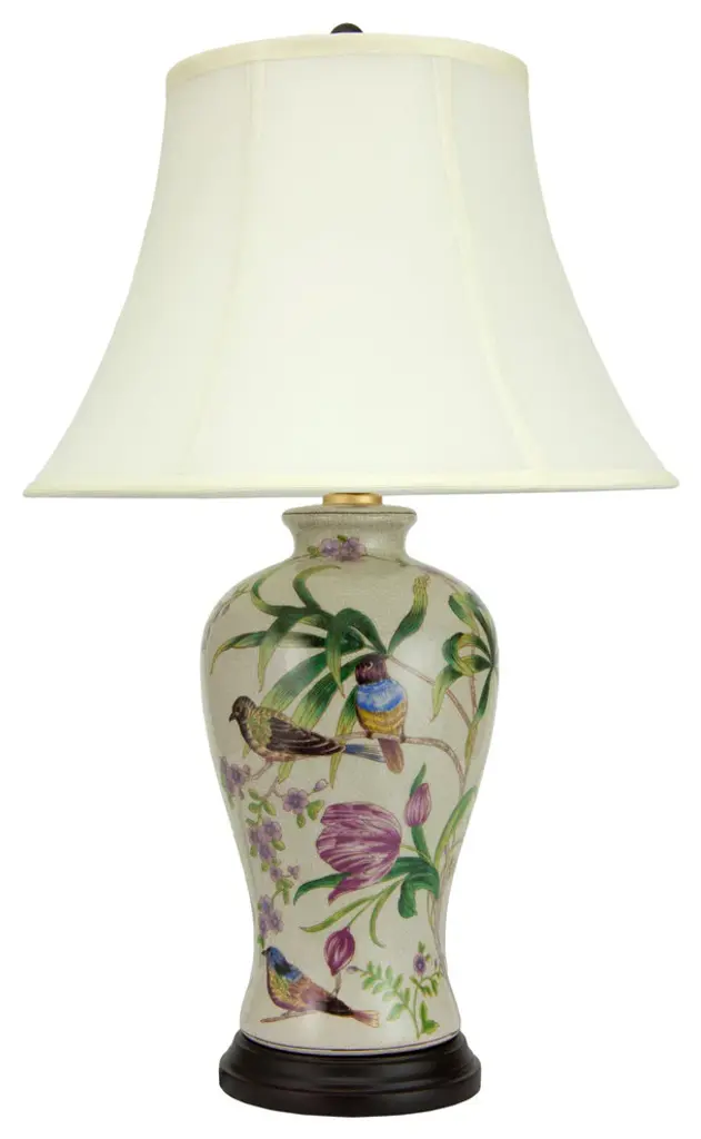 We are Asian Style Furnishing and we are here to help you add beautiful Asian colors and history to your home. We speciallize in porcelain items as well as creating fantastic lighting with our pieces. All of our items are for decorative use only not good for food storage. All of our items are for decorative use only not good for food storage. We have been in business for over 30 years and I am the second generation to be in this business. I am excited to bring my energy and family experience to those in need of some Eastern influences in their home. Please note : As most of our porcelain pieces are hand made and hand painted they may be slightly different from the photo in both shape and the way it is even colored! We do our best to find the one that is most common but sometimes they will be slightly different. Floral Bird Motif Porcelain Tea Caddy Table Lamp 19.5" Country of Origin: China Dimensions (in inches): Height 19.5" Length: 12" With shade Watts:60 Number of Bulbs: 1 UL LISTED: YES Bulbs Not Included Comes with Shade and Finial