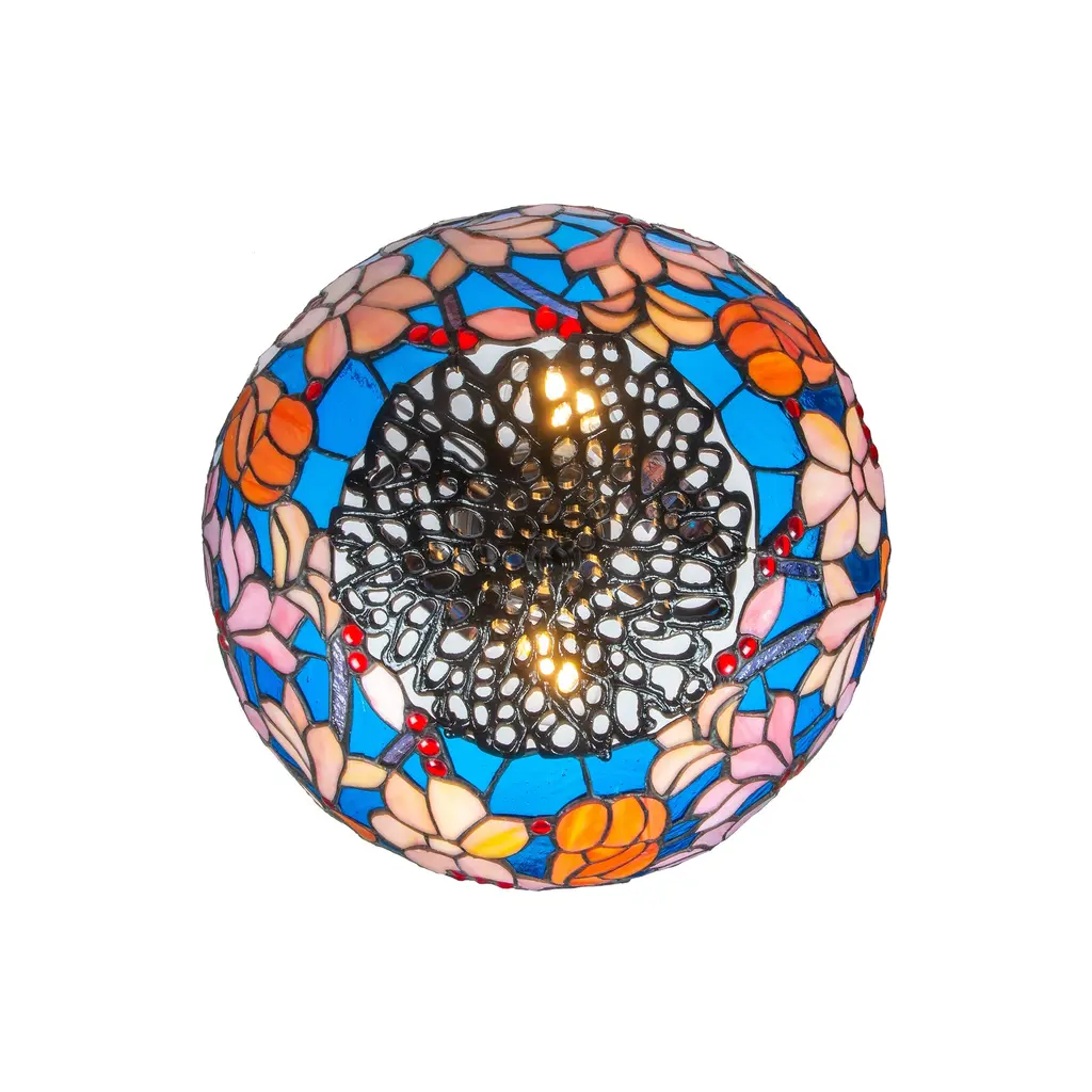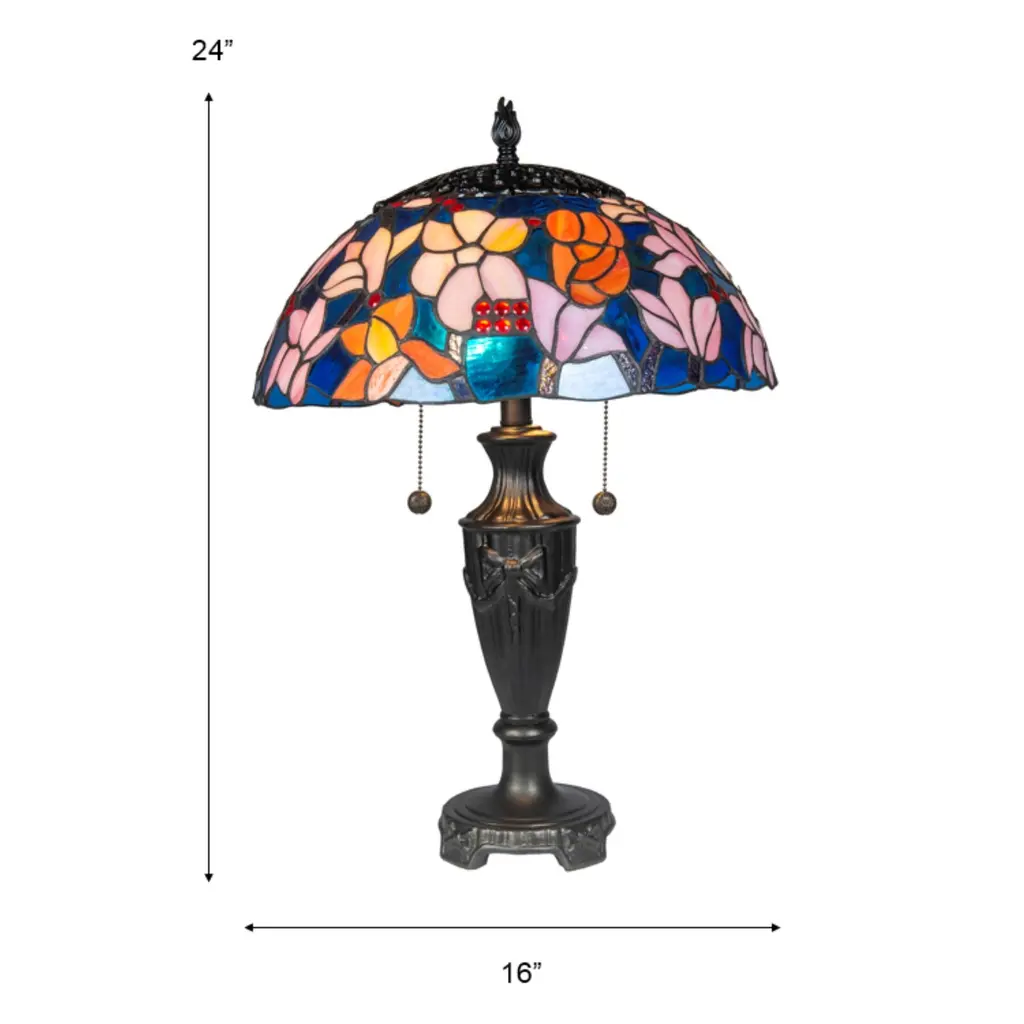 Illuminate your space with the timeless elegance of the Florieta Dale Tiffany Table Lamp. Drawing inspiration from nature's beauty, this exquisite lamp showcases a shade that paints a picturesque scene of delicate pink and red flowers set against a serene blue background, punctuated by charming red berries. Each detail is meticulously crafted from copper foil soldered stained glass, reflecting a rich tapestry of colors when lit. The lamp's antique bronze finish metal base complements the vibrant shade, adding a touch of vintage charm to its overall design. Its sturdy construction ensures durability while exuding sophistication, making it a perfect addition to any room. Whether placed in a living room, study, or bedroom, the Florieta Dale Tiffany Table Lamp stands as a testament to classic artistry and modern craftsmanship. Let it be the centerpiece that infuses your space with warmth, color, and artistic brilliance.