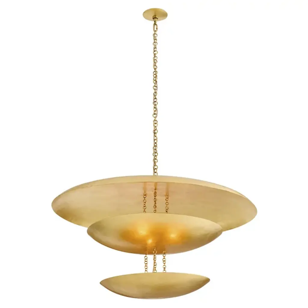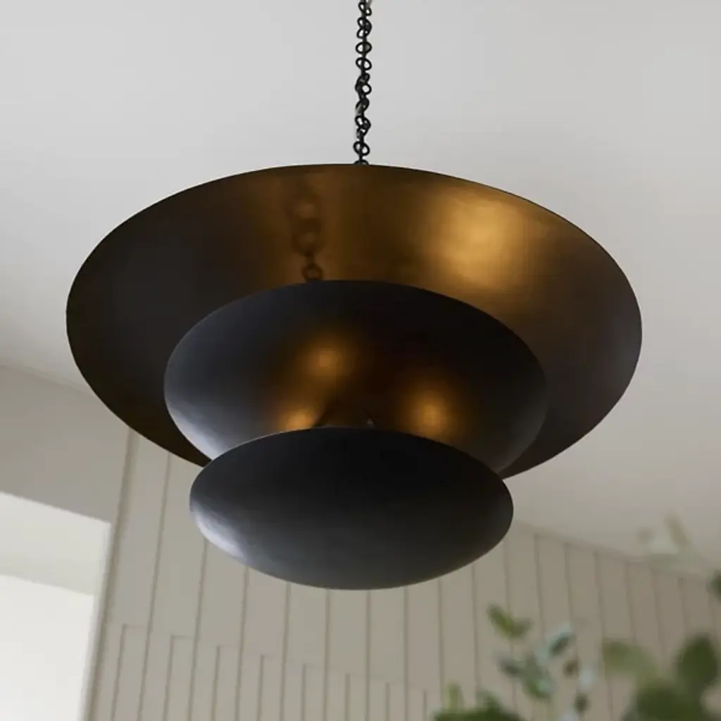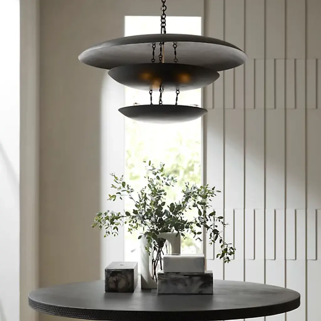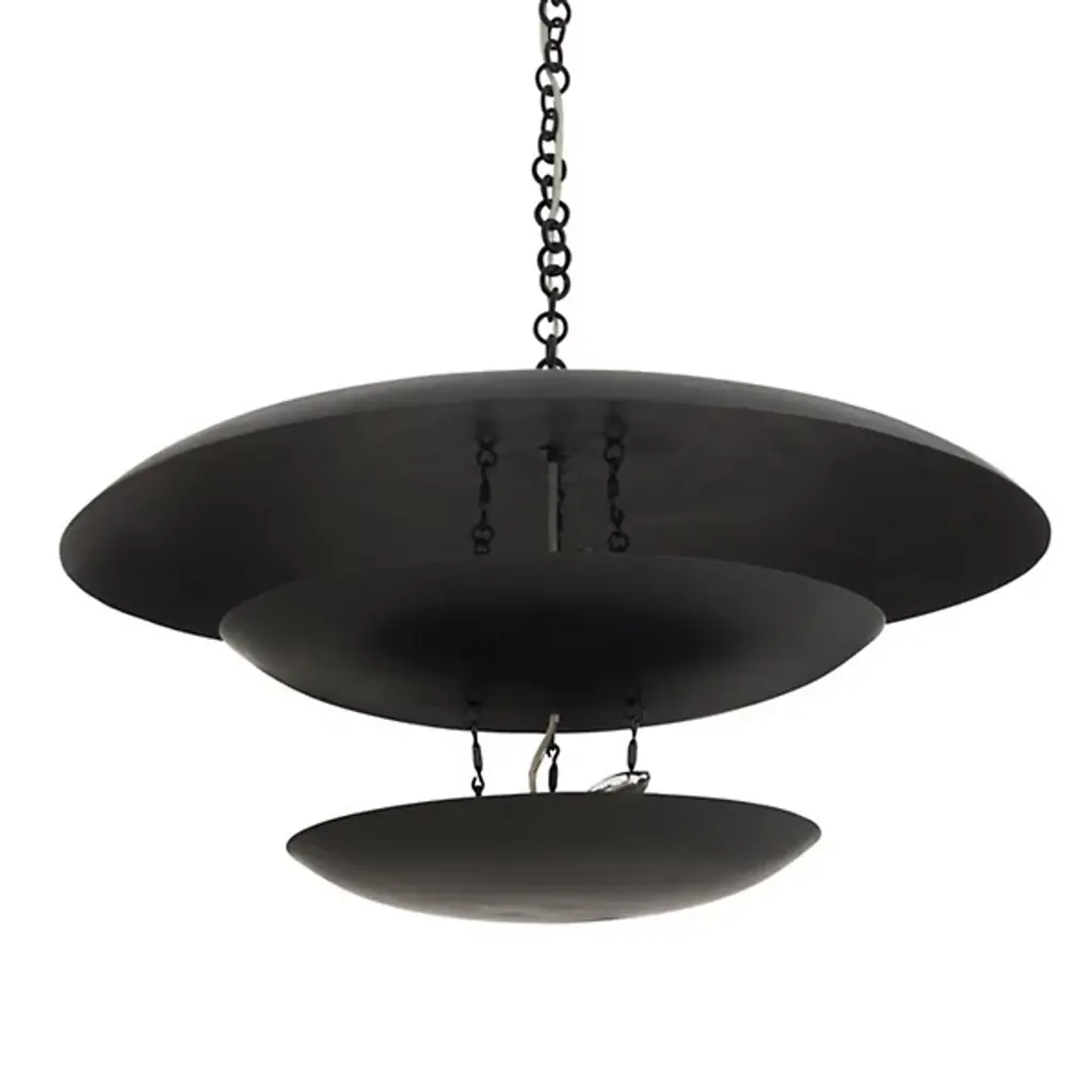 The Arteriors Florko Chandelier has a modern design that seemingly floats in space. This space age fixture features three discs made of iron with the largest on top followed by two smaller concave discs below. The two lower levels hold the lamps, the illumination being thrown upward to create a lit atmosphere with a unique flair.