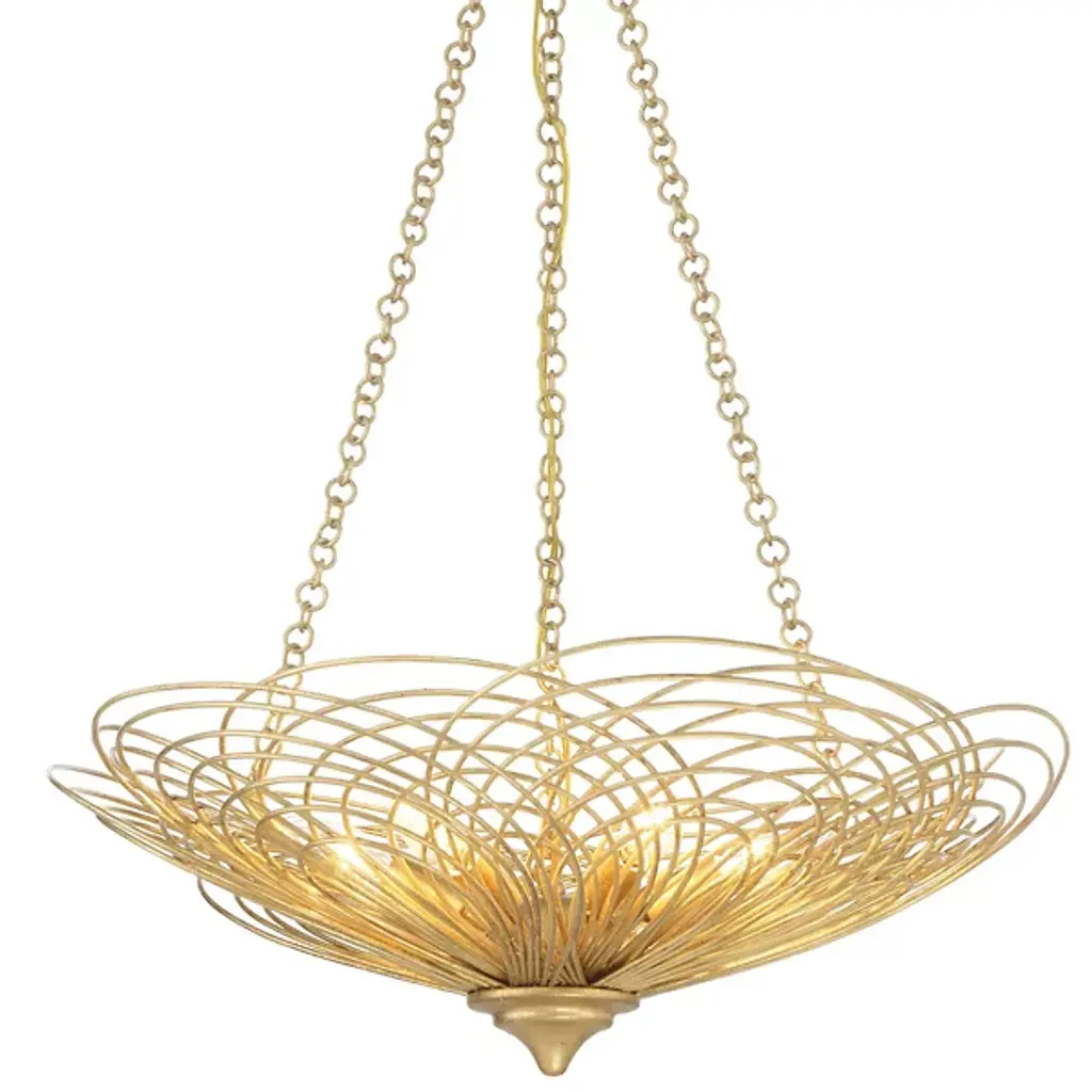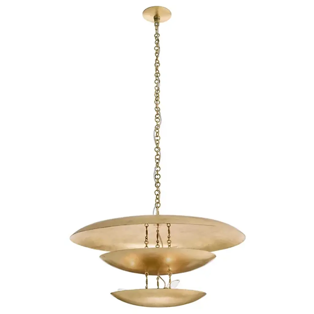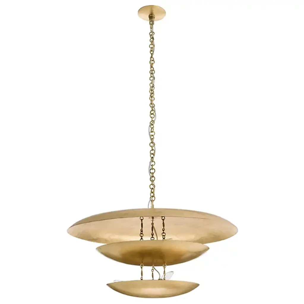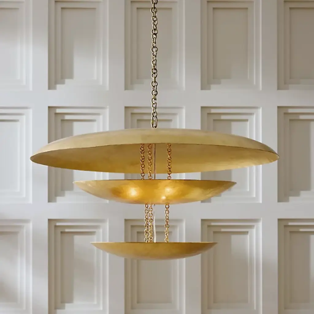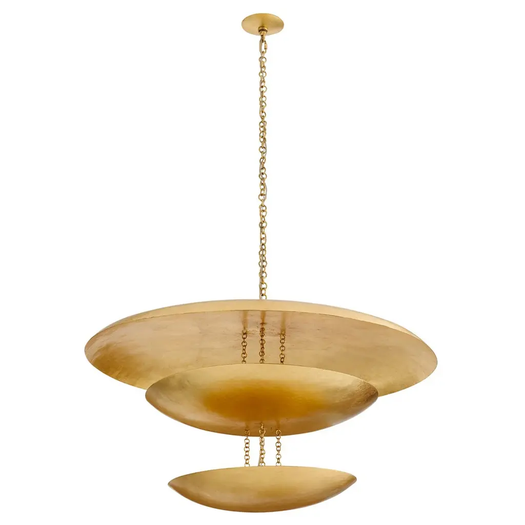 The Arteriors Florko Chandelier has a modern design that seemingly floats in space. This space age fixture features three discs made of iron with the largest on top followed by two smaller concave discs below. The two lower levels hold the lamps, the illumination being thrown upward to create a lit atmosphere with a unique flair.